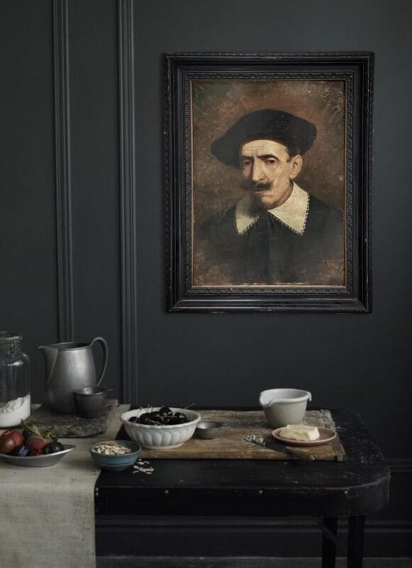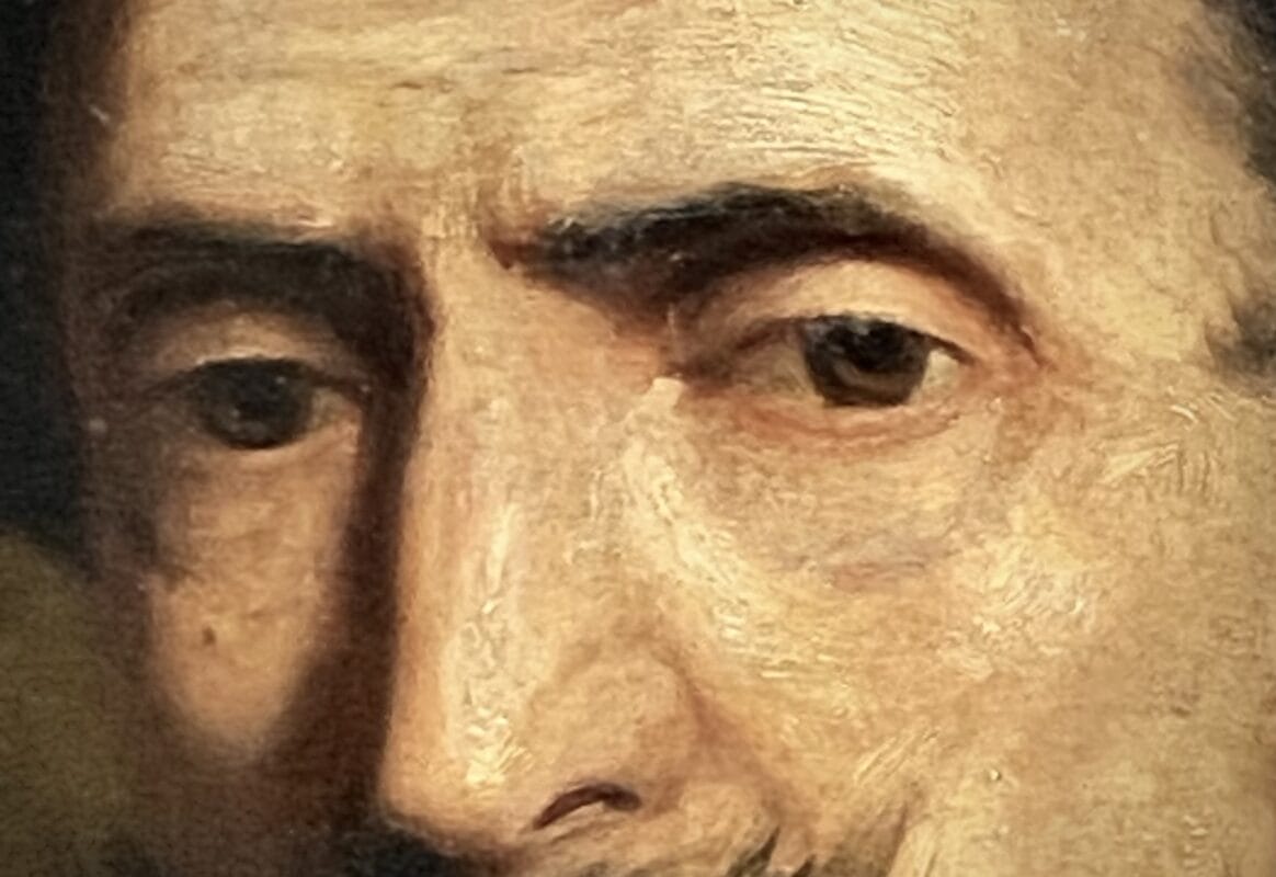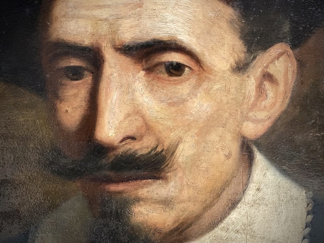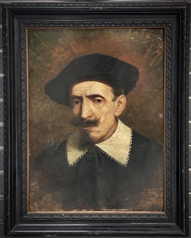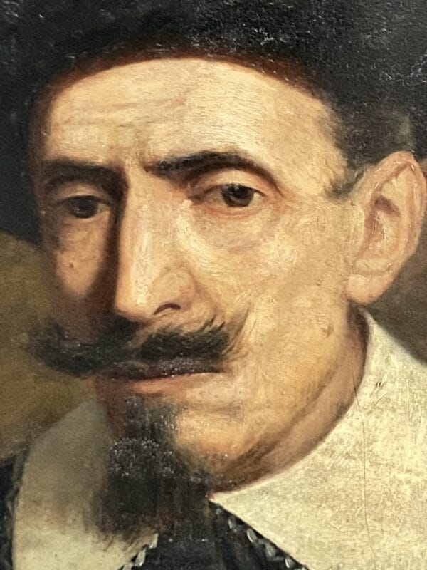 Raffinato ritratto di un gentiluomo, caratterizzato da intensa forza psicologica e da una resa realistica di grande qualità. Il volto, con lo sguardo penetrante e i dettagli del copricapo nero, della barba e del colletto in lino, richiama la ritrattistica barocca del Nord Europa, con influssi fiamminghi e olandesi (Rembrandt, Hals).