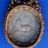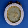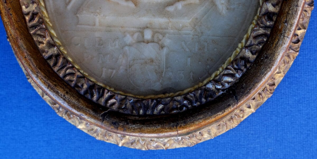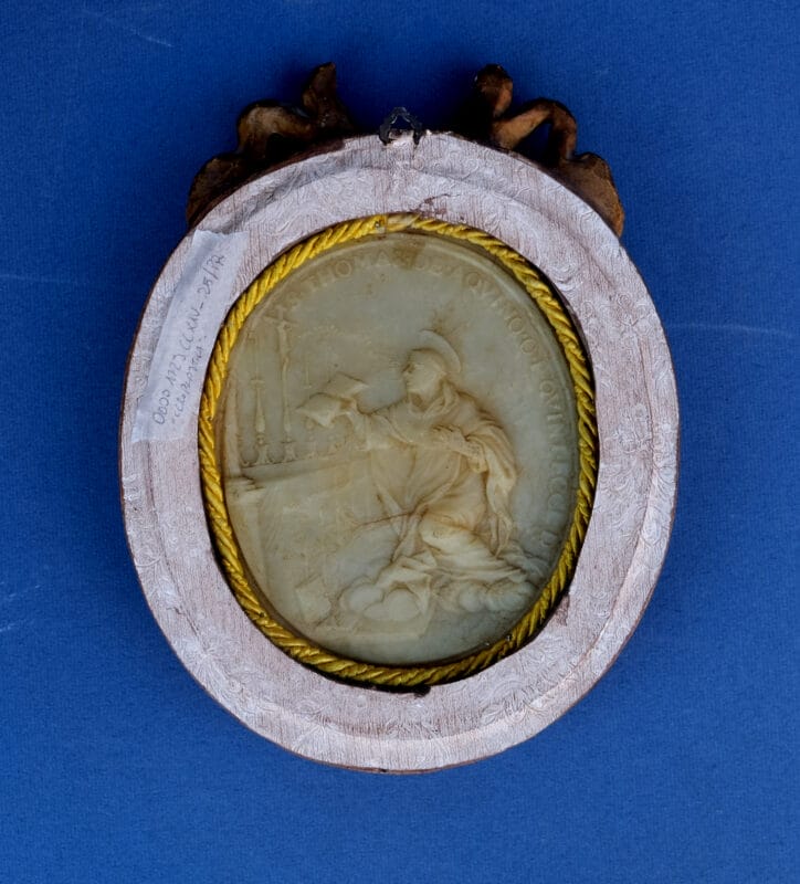 Oggetti di devozione, dotati da un fascino straordinario che ne hanno decretato fin dalle origini un grande favore collezionistico, i cosiddetti “Agnus Dei” sono piccole tavolette di cera, su cui veniva impressa la figura dell’Agnello Pasquale, coricato su di un libro e con vessillo a fianco: nel giro, la frase (spesso abbreviata, come nel nostro caso, per motivi di spazio): “ECCE AGNUS DEI QUI TOLLIT PECCATA MUNDI”. In basso, assai spesso, il nome del Papa che li aveva benedetti e consacrati (nella fattispecie, Clemente XII), unitamente all’anno riportato in numeri romani (1731) a incorniciare lo stemma del Pontefice. La loro forma era circolare o ovale (da quel poco che ho potuto trovare e vedere in rete, forse era più diffusa la forma ovale), di dimensioni variabili, ma comunque sempre paragonabili, per dare un’idea, a quella di una medaglia portativa. La loro lavorazione era identica a quella delle medaglie papali. La straordinarietà degli Agnus Dei stava nel fatto che essi venivano confezionati non con una cera qualsiasi, ma con i resti del cero pasquale della Cappella Sistina e delle altre Chiese di Roma, i quali venivano benedetti personalmente dal Papa in una cerimonia molto sentita dai fedeli e che si teneva ogni sette anni la settimana dopo Pasqua. Proprio questa loro particolarità (benedizione personale del Pontefice) li rendeva assai preziosi e soggetti a norme rigorosissime nel loro utilizzo: non potevano essere commerciati (pena la perdita delle loro virtù) e custoditi possibilmente in teche al fine di preservarne l’integrità. Proprio l’uso delle teche ,impedisce di vedere il retro del manufatto, anch’esso ornato. Nella ceroplastica qui presentata, il problema è stato intelligentemente ovviato asportando lo schienale della teca, in modo da poter ammirare ammirarne anche il retro, raffigurante una commovente “Visione di San Tommaso d’Aquino”.