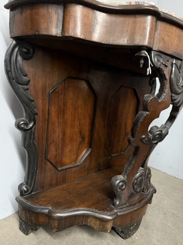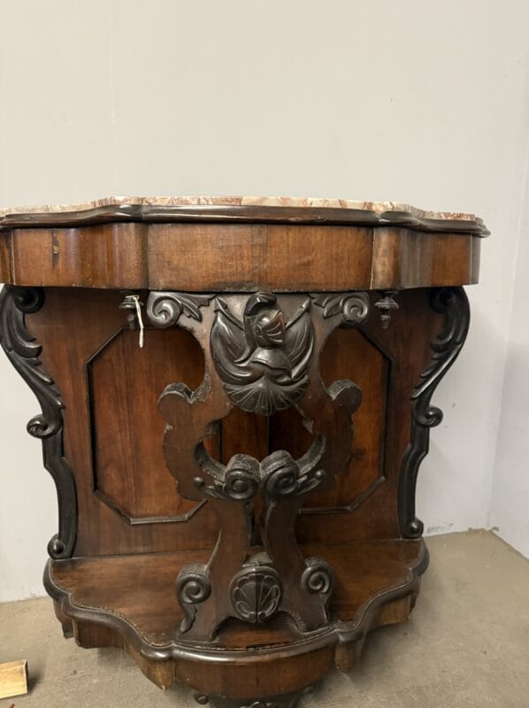 Antica console in noce Luigi Filippo, metà ‘800, Napoli, 100x103x43cm. Piano in marmo, intagliata frontale con bellissimi intagli. Mobile non restaurato.