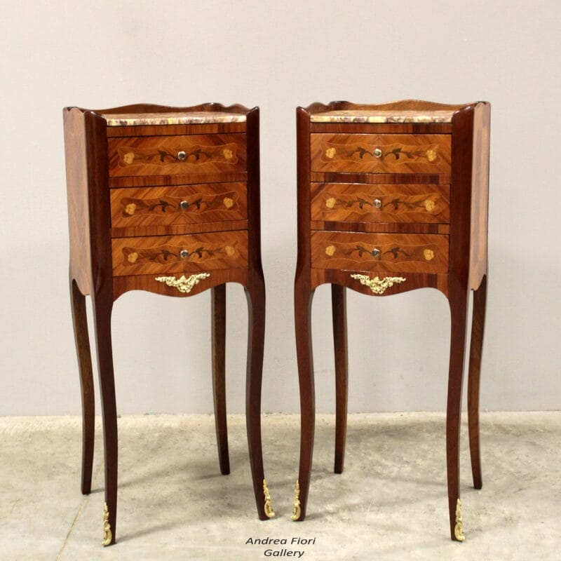 In bois de rose a marqueterie, intarsiati e filettati in vari legni pregiati, con piano in marmo e completi di bronzi dorati originali – con 3 cassetti