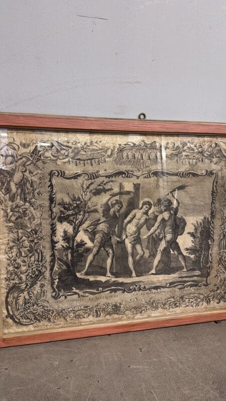 Antica incisione acquaforte flagellazione di Cristo XVI sec, 89x65cm. In cornice laccata color arancio. Protezione con vetro.