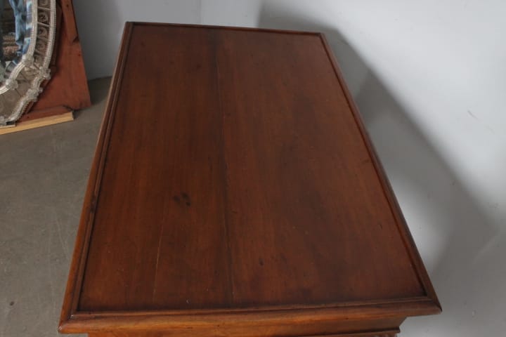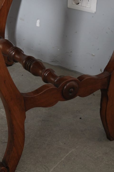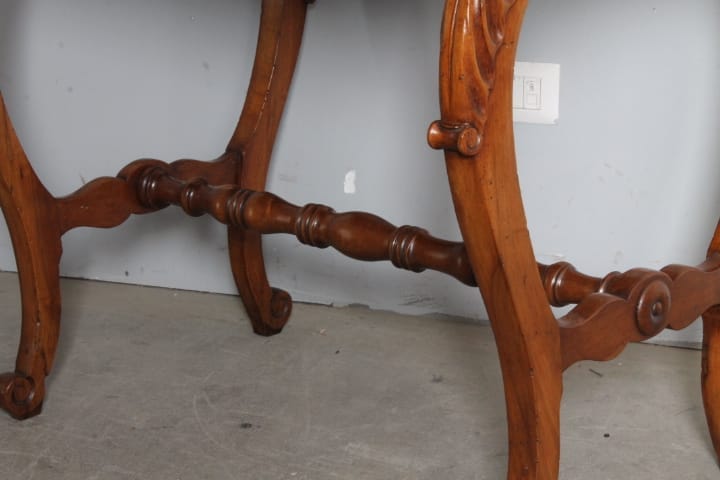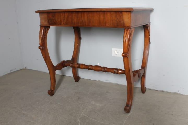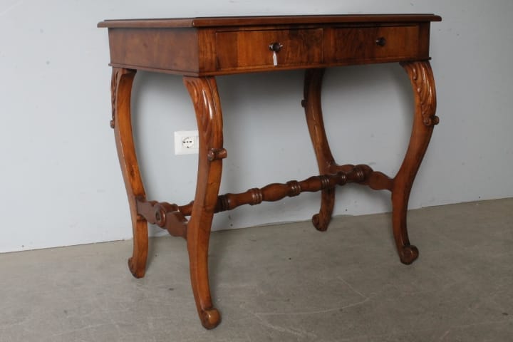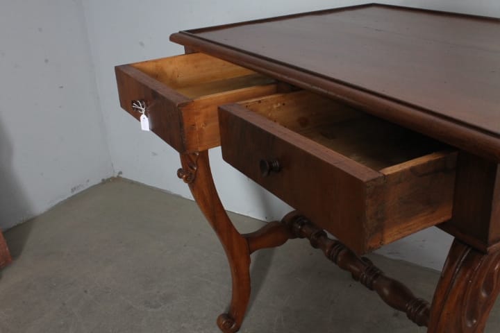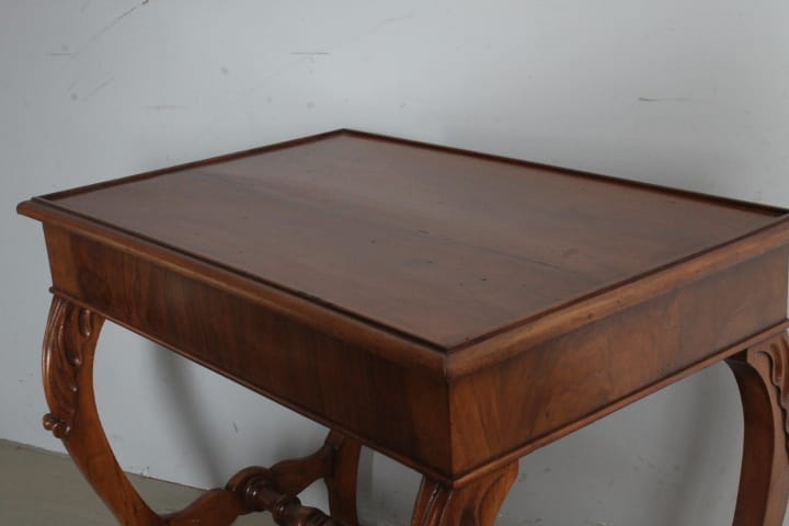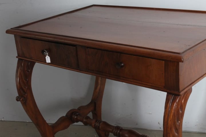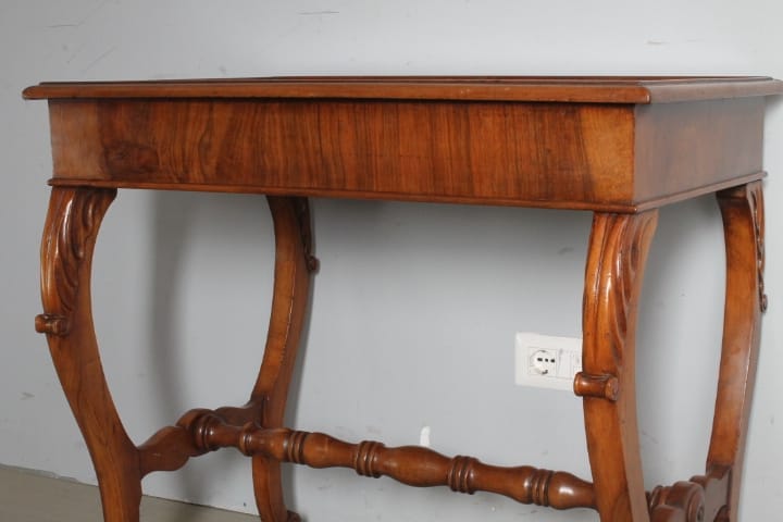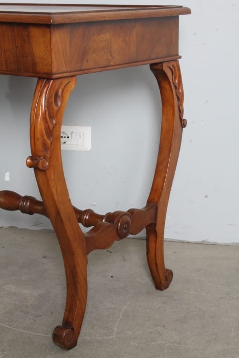 Antica scrivania scrittoio Luigi Filippo noce Toscano metà 800 , due cassetti , gambe mosse sia anteriori che posteriori , raccordo finemente tornito . Bellissimi intagli , mobile di grande qualità , restaurato con finitura cera d api . Non necessita di alcuni intervento .Mis 84x 55 h 78