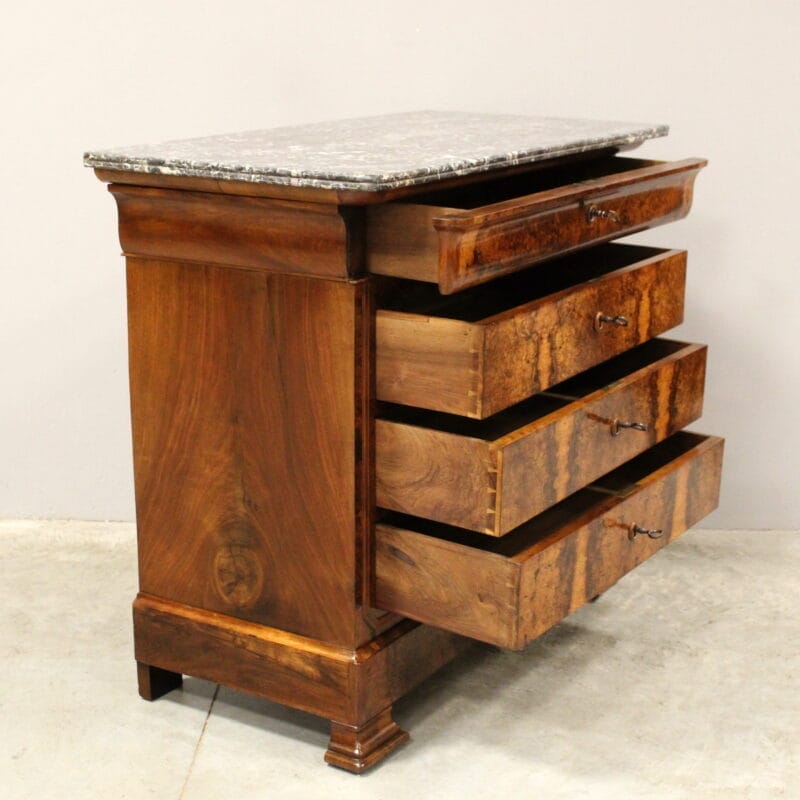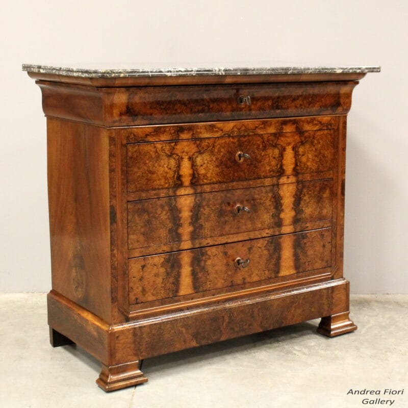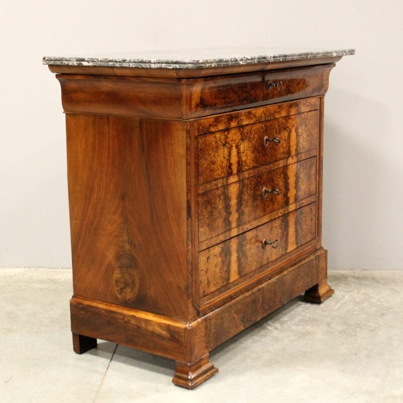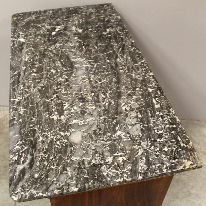 In noce massello , lastronato in noce e radica di noce , con piano in marmo – da notare le piccole dimensioni
