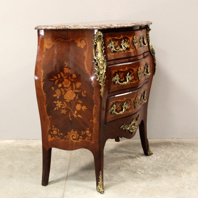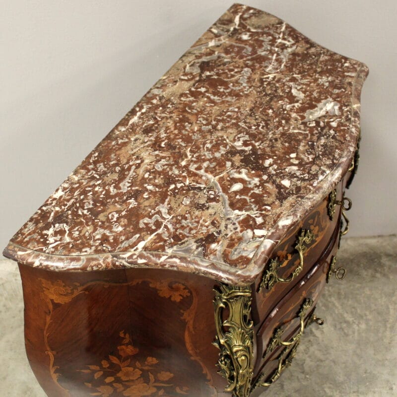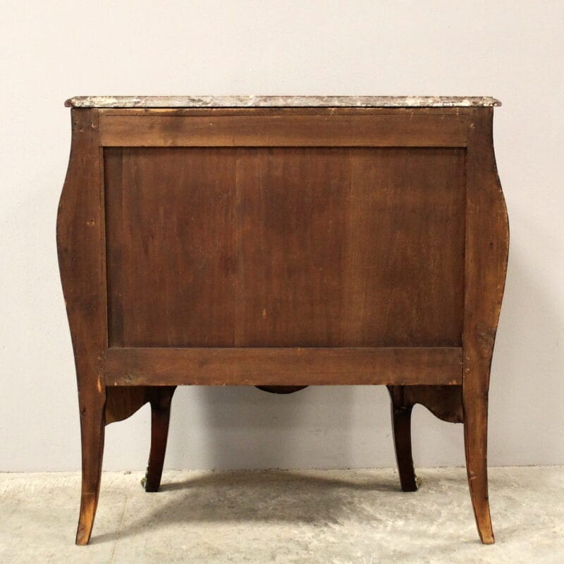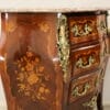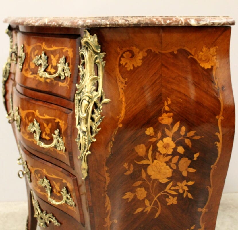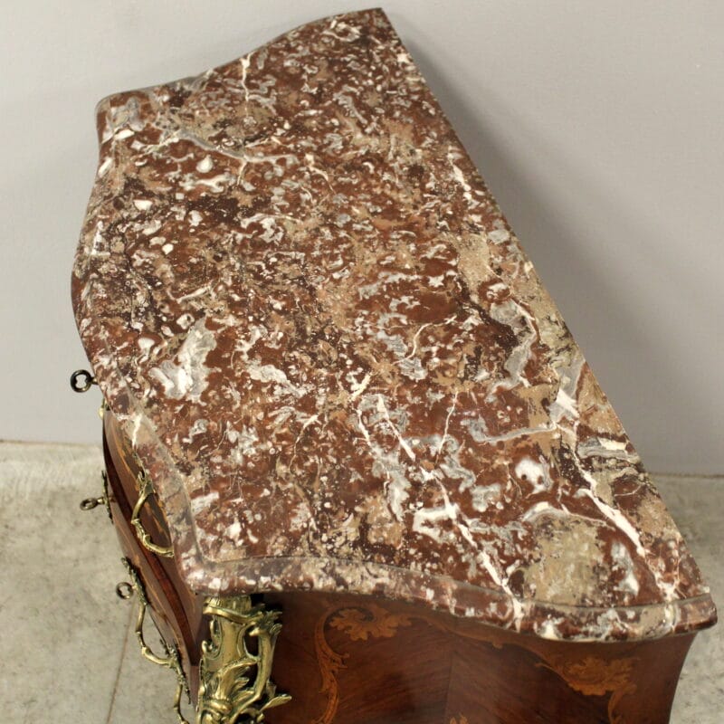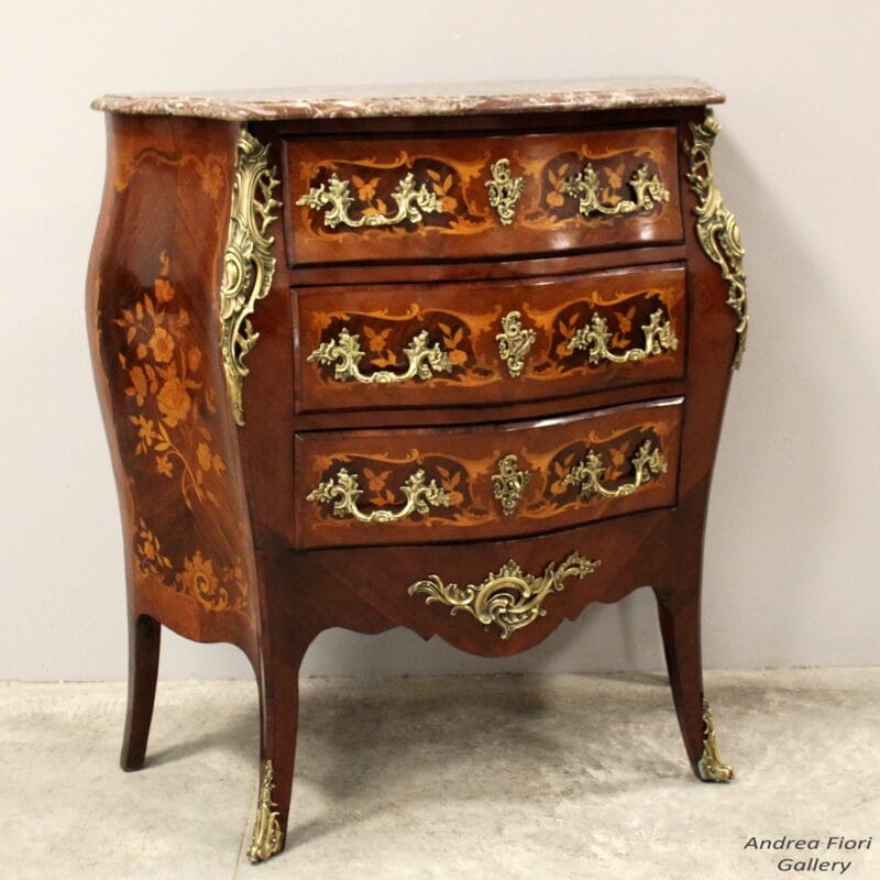 In bois de rose a marqueterie, elegantemente intarsiato e filettato in vari legni pregiati, con piano in marmo e completo di splendidi bronzi dorati originali – da notare le piccole dimensioni