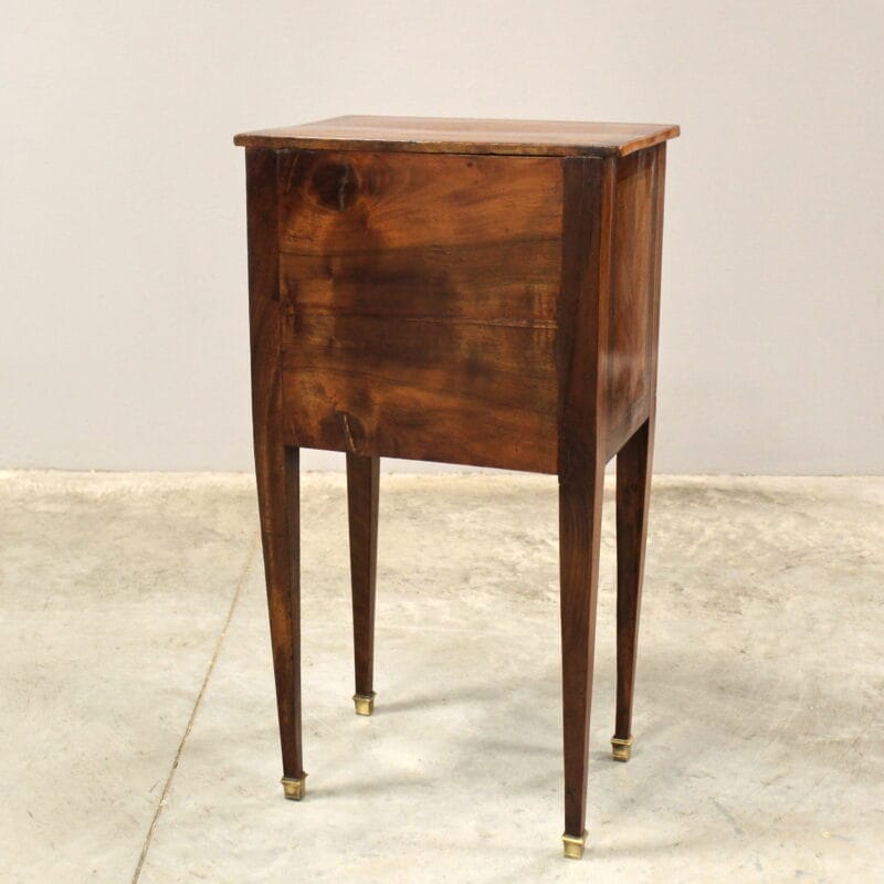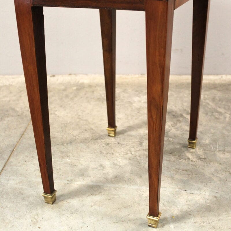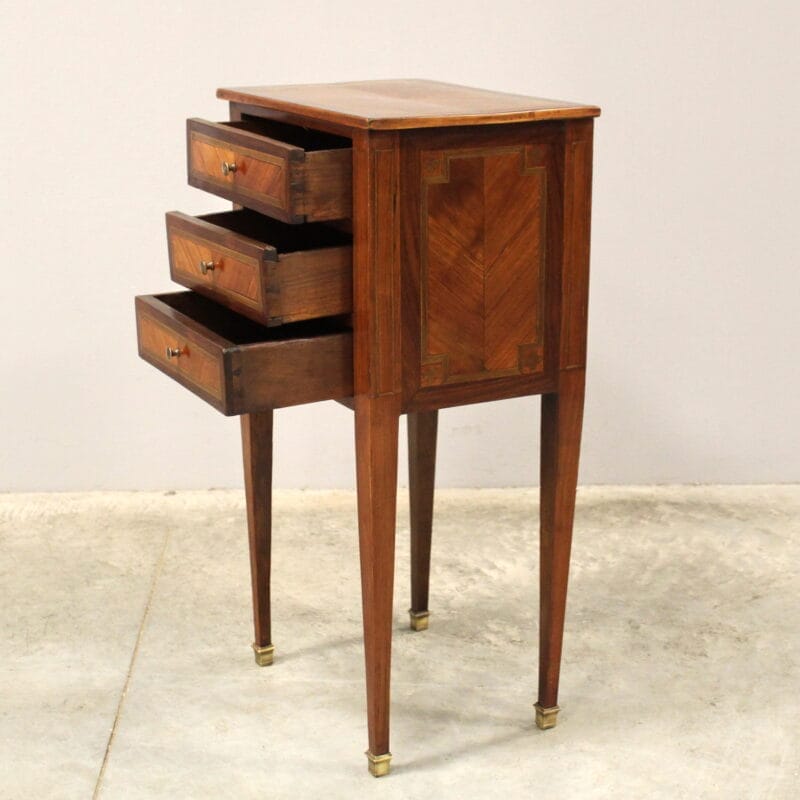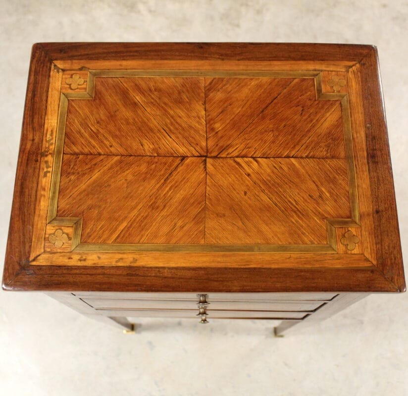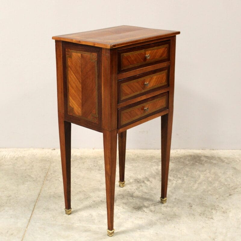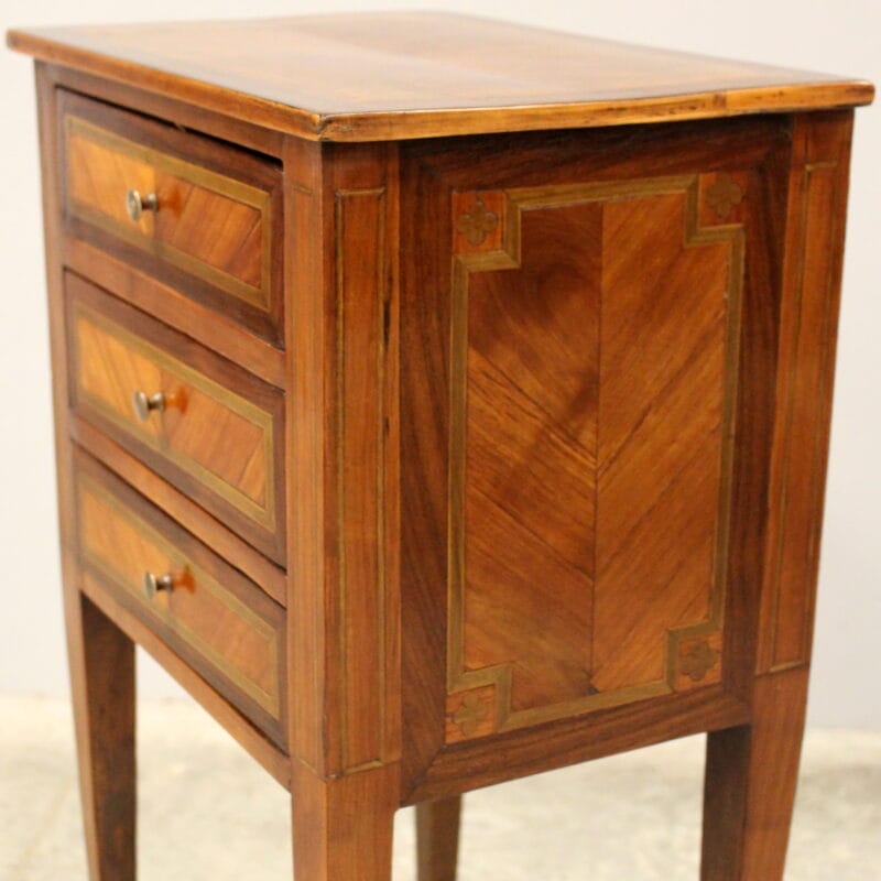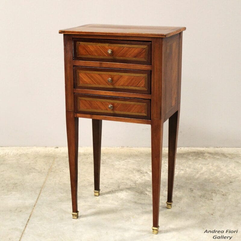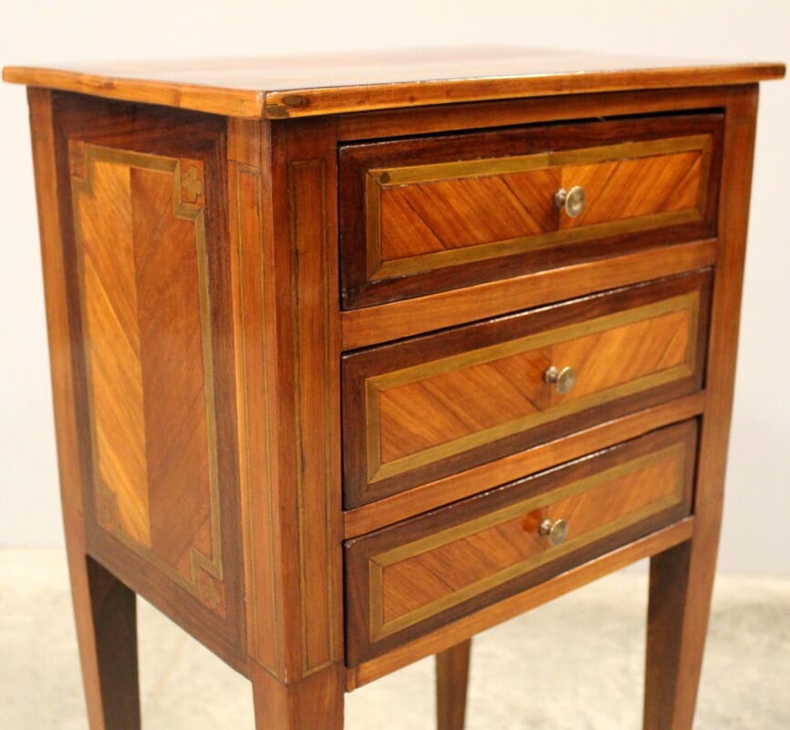 In bois de rose a marqueterie, elegantemente intarsiato e filettato in vari legni pregiati – con 3 cassetti