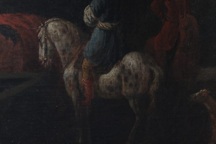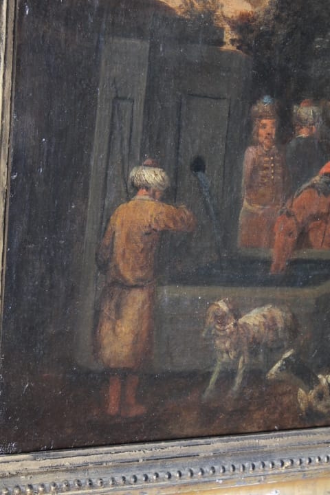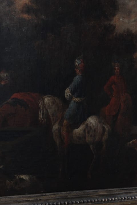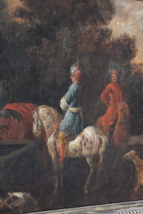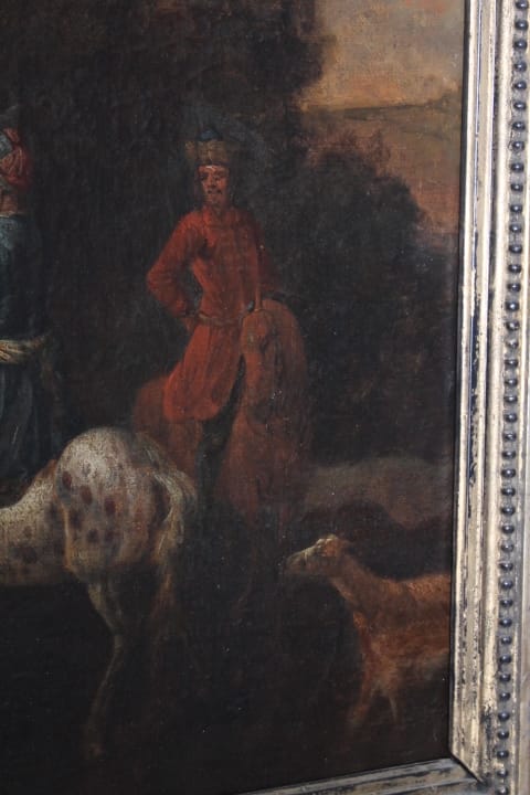 Antico dipinto olio su tela Fiammingo primi 800 . raffigurante cavalieri orientali e animali . Mis 70 x cm 54, misure solo tela cm 55 x cm 38,50 compresa cornice dorata antica. Non restaurato .