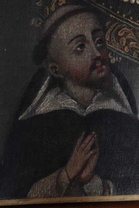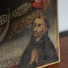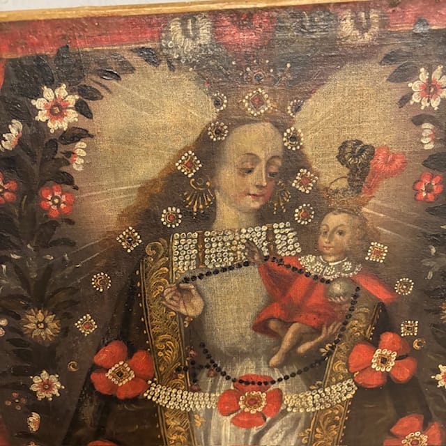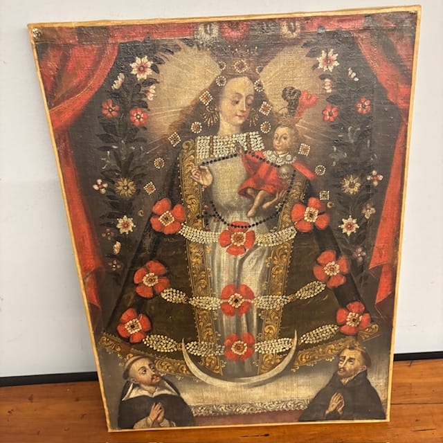 Antico e raro dipinto scuola di Cuzco Olio su tela XVII sec Madonna di Pomata,Gesu’ , S. Nicola da Tolentino e S. Francesco. Mis 57x 42,5. Stato di conservazione buono , non necessita di interventi . Prezzo su richiesta.
