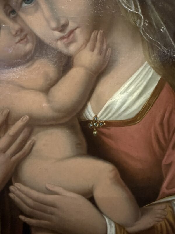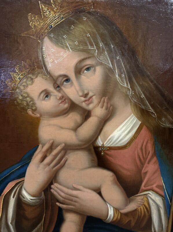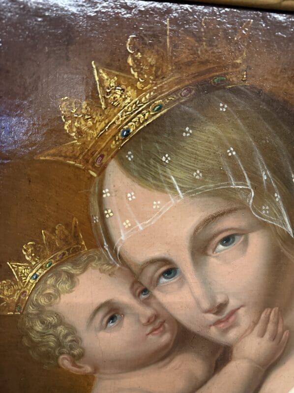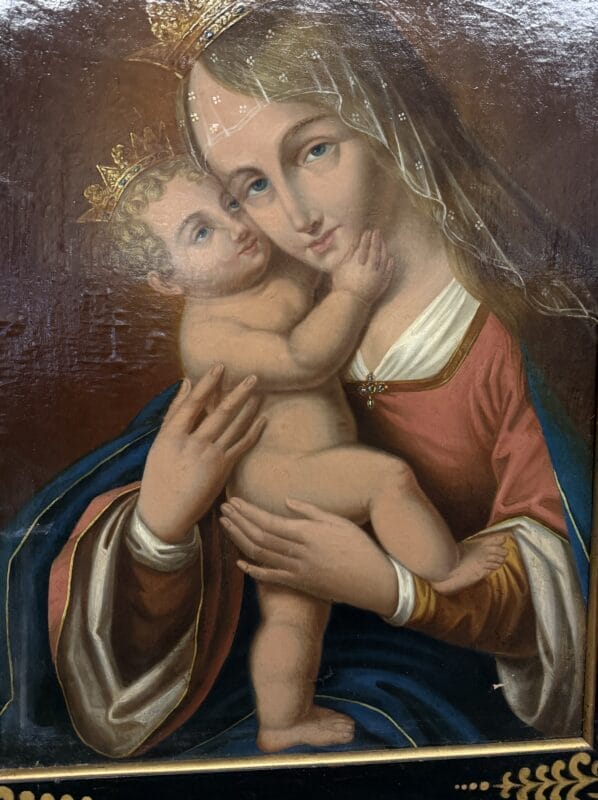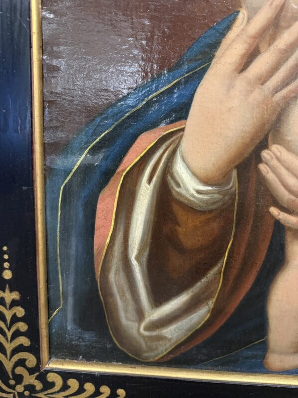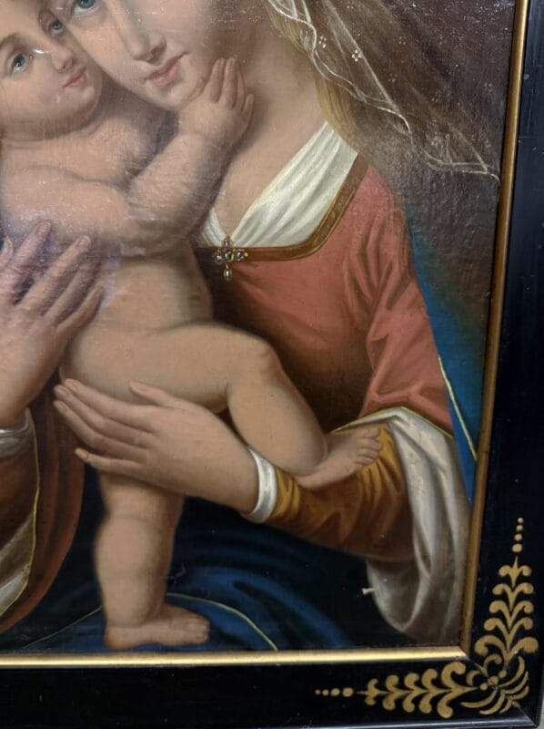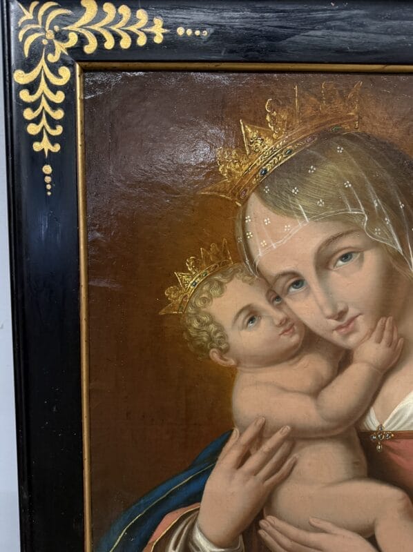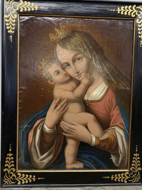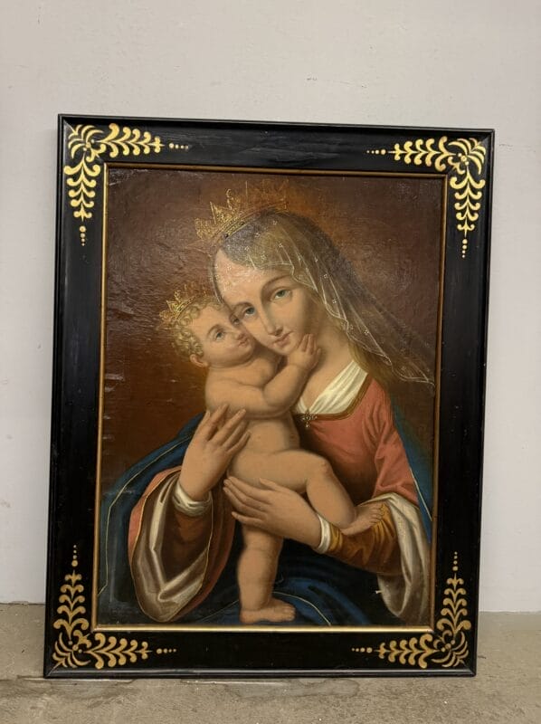 Antico dipinto Vergine e Bambino, olio su cartone, XIX sec, in cornice nera, antica e laccata con rifiniture in oro. Mis 74x58cm compresa di cornice, solo dipinto 63x47cm. Buono stato di conservazione.
