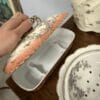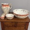 Antico set da toilet in porcellana Limoges per Bourgeois Paris, fine’800, 30x40cm. Composto da grande bacile (cm 40 diametro) grande versatoio (h30cm), bacile portasapone e contenitore per pettini. Marchiato alla base Limoges per Bourgeois Paris. Dipinto con motivi floreali su bianco e salmone con rifiniture in oro. Buono stato di conservazione.