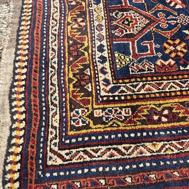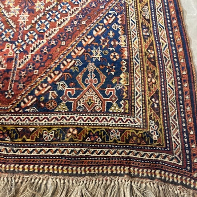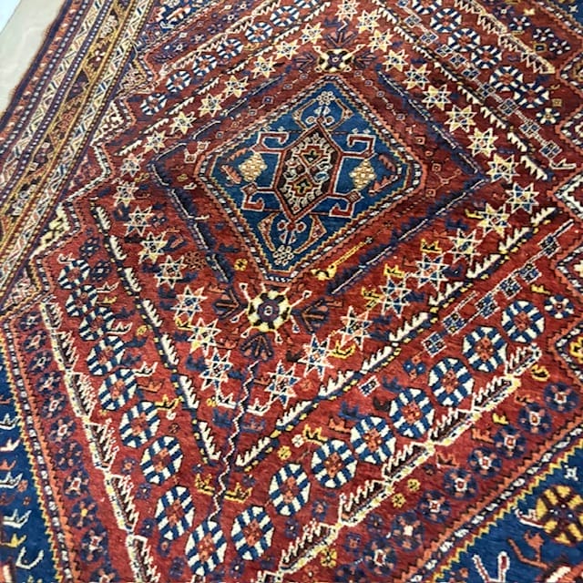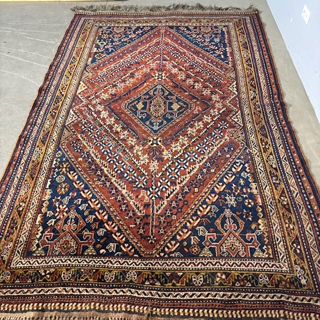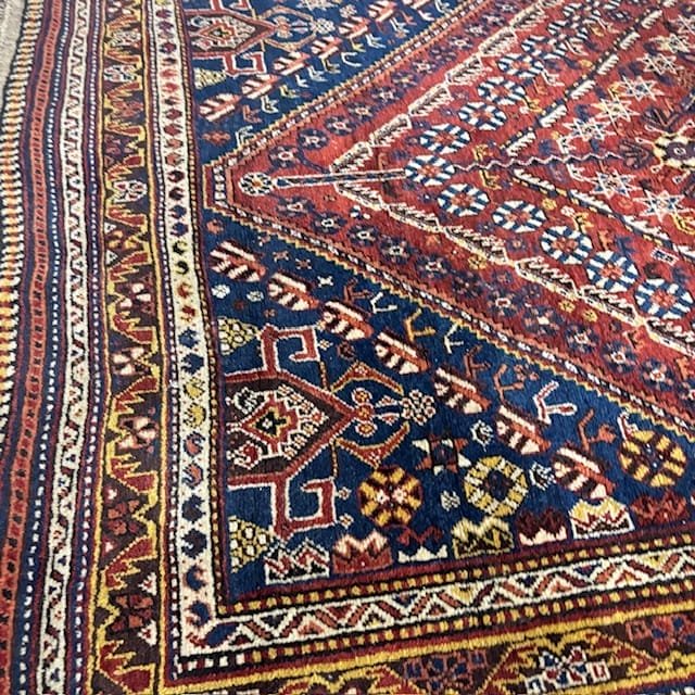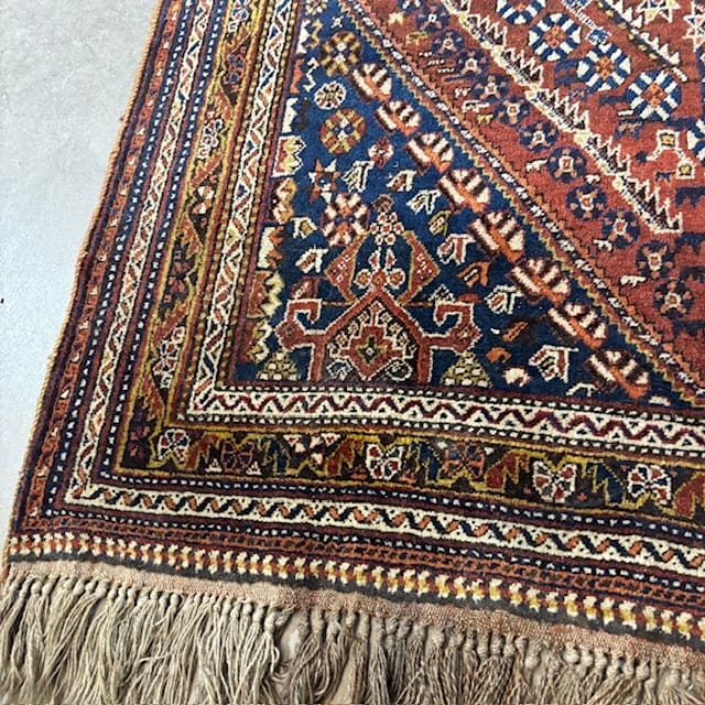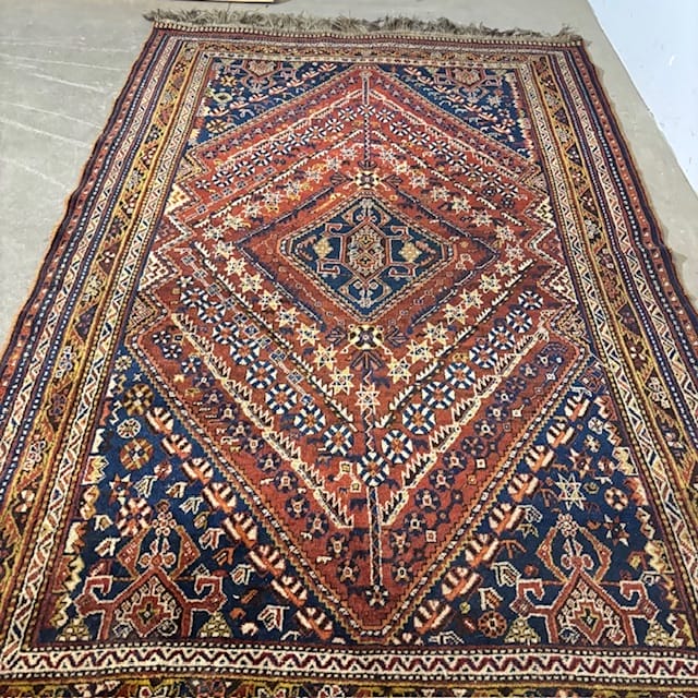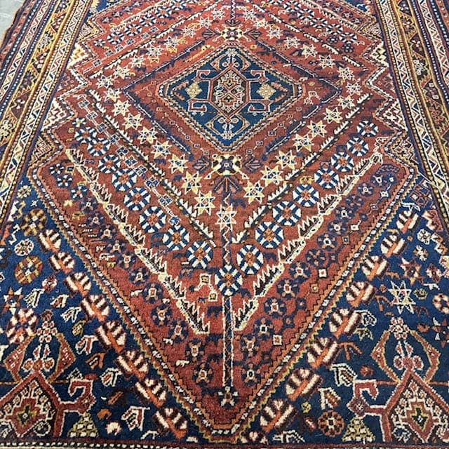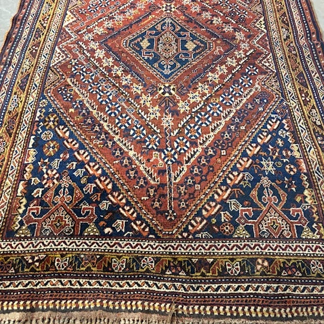 Antico e bellissimo tappeto persiano annodato a mano di bellissima qualità , primi 1920 ca manifattura Qashqai . Mis 270 x cm 162 a motivi geometrici . Stato molto buono.