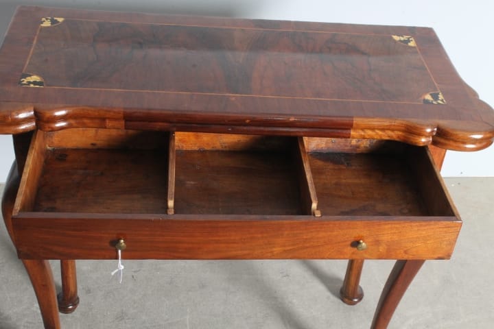 Antico tavolinetto da gioco Console Luigi XV epoca metà 700 . Noce massello le gambe , placcato in noce il piano con intarsi in acero e osso . Piano che si apre e diventa un tavolo da gioco con piano verde e fossette scavate per il gioco . restaurato . Mis 87 x cm 39 . h72 Aperto diventa cm 87 x 78