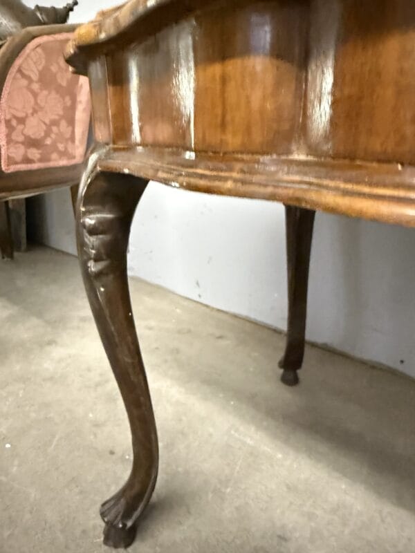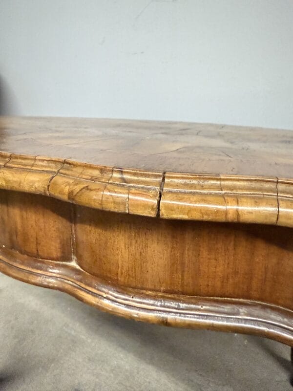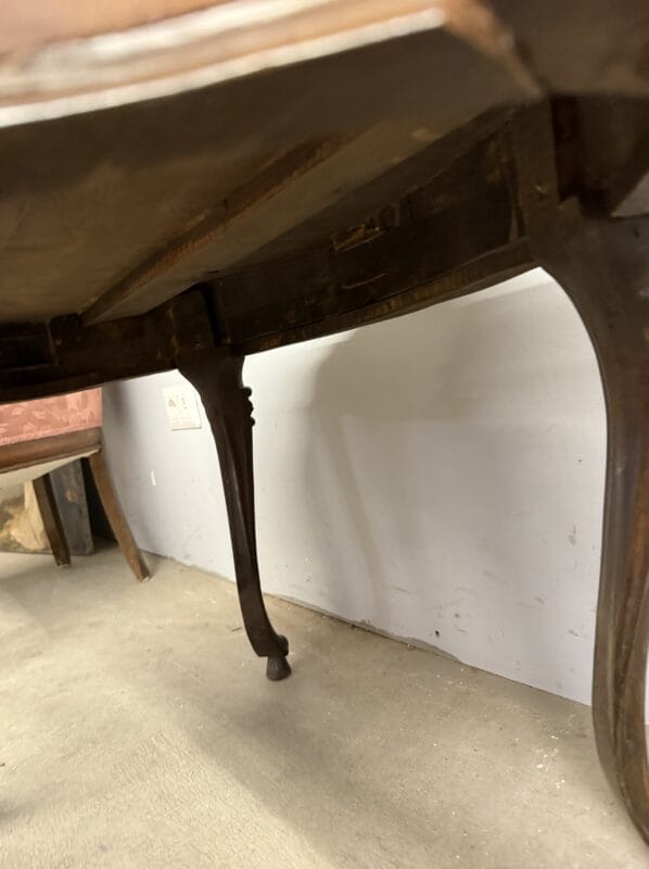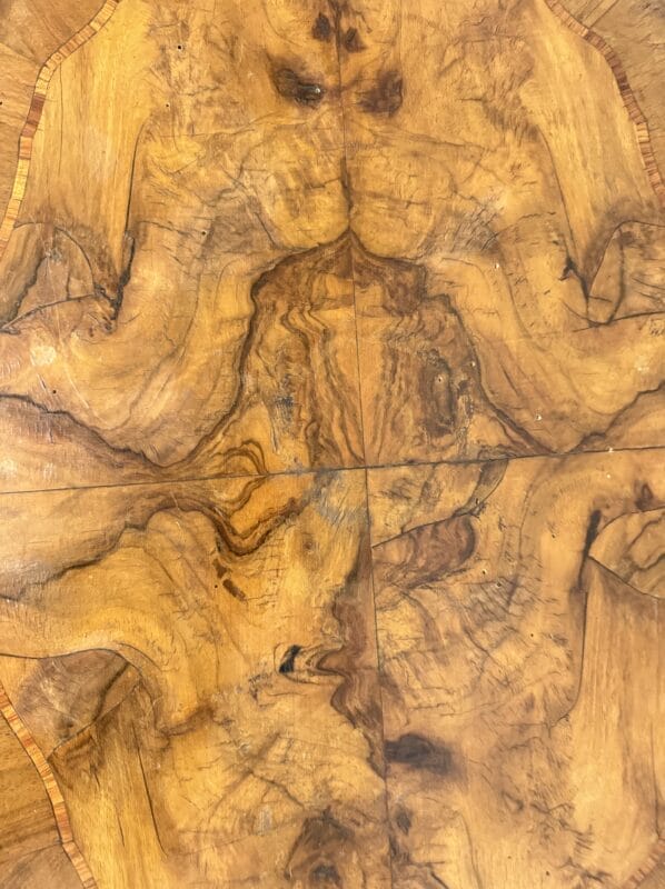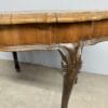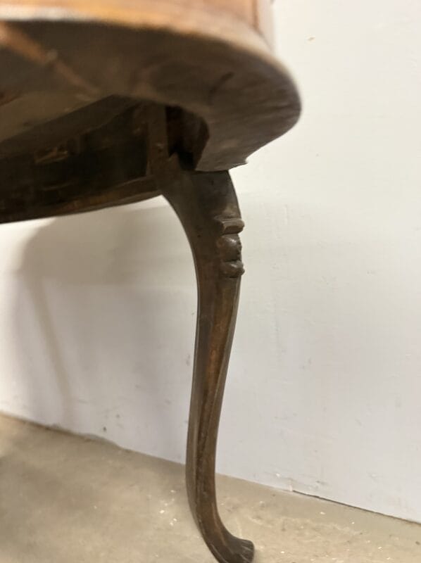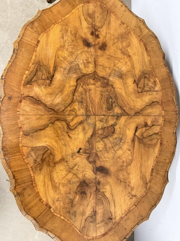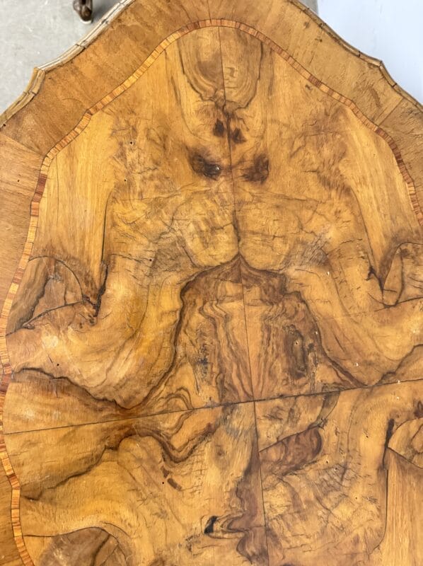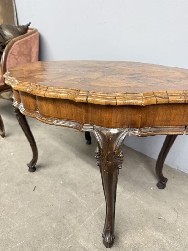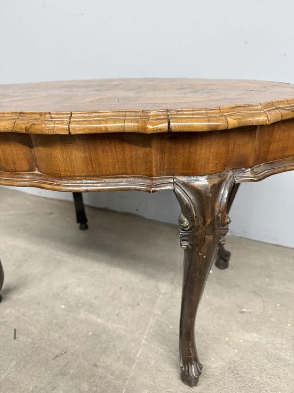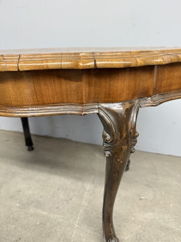 Antico tavolinetto da salotto/fumo 1940 in noce e radica barocchetto, 55x80x50cm. Realizzato in noce massello con gambe intagliate. Piano in lastronato di noce e radica. Buono stato di conservazione.