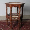 Antico tavolinetto esagonale di gusto liberty , realizzato in noce massello con gambe tornite e con piani dipinti in ceramica epoca 1930 . diametro cm 60 h 74 Sotto il ripiano riporta etichetta originale dell’ epoca del negozio. Mobile non restaurato ( su richiesta possibile effettuare il restauro )