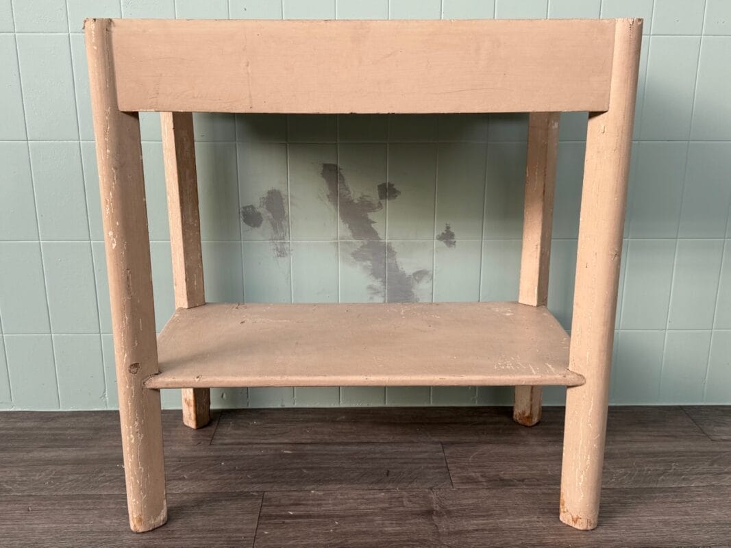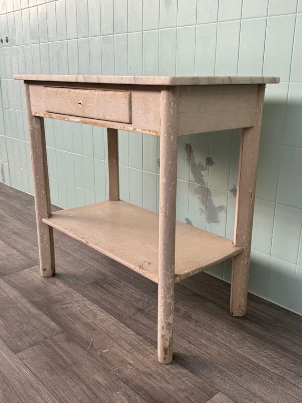 Questo raffinato tavolino d’epoca unisce il fascino del legno vissuto alla sobria eleganza del marmo, creando un pezzo d’arredo ideale per ambienti dal gusto classico o eclettico. La struttura in legno, segnata da una patina autentica e da leggere usure che ne raccontano la storia, è impreziosita da un piano in marmo bianco con venature grigie.