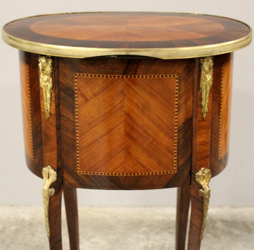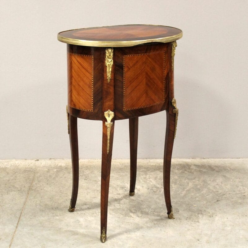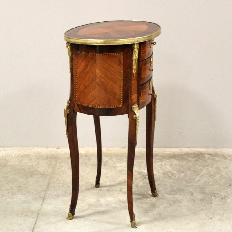 In bois de rose a marqueterie, elegantemente intarsiato e filettato in vari legni pregiati , completo di splendidi bronzi dorati originali e all’interno specchio originale – con 2 cassetti