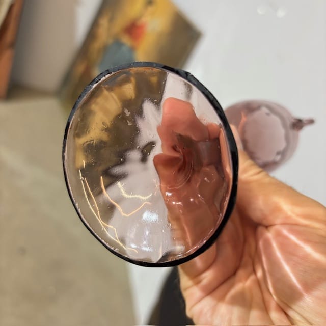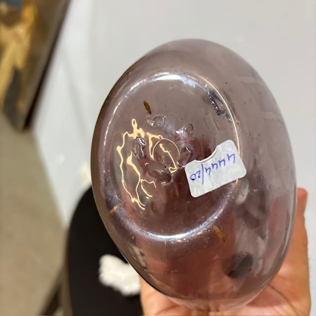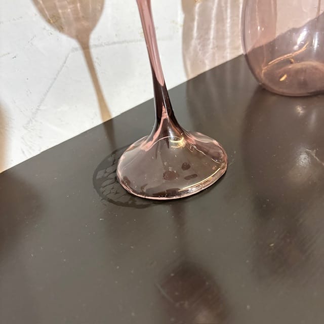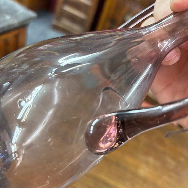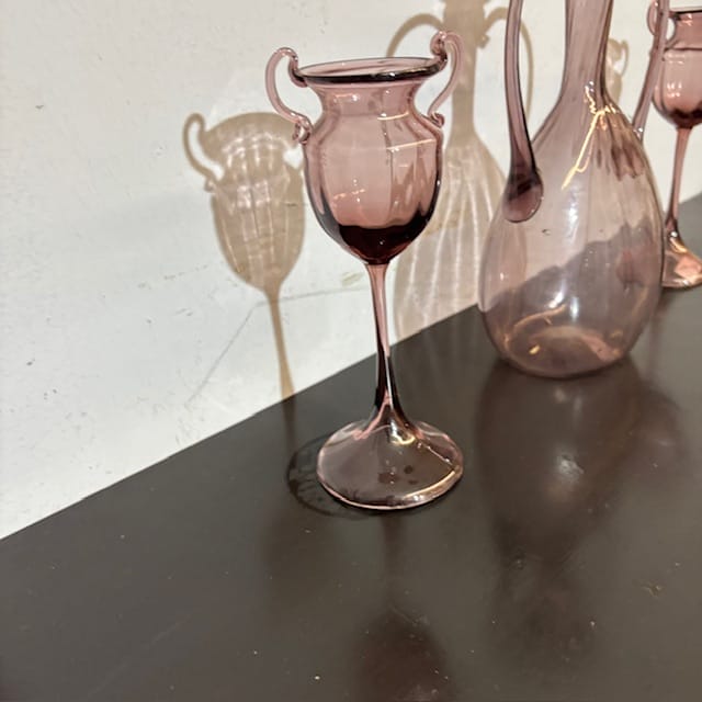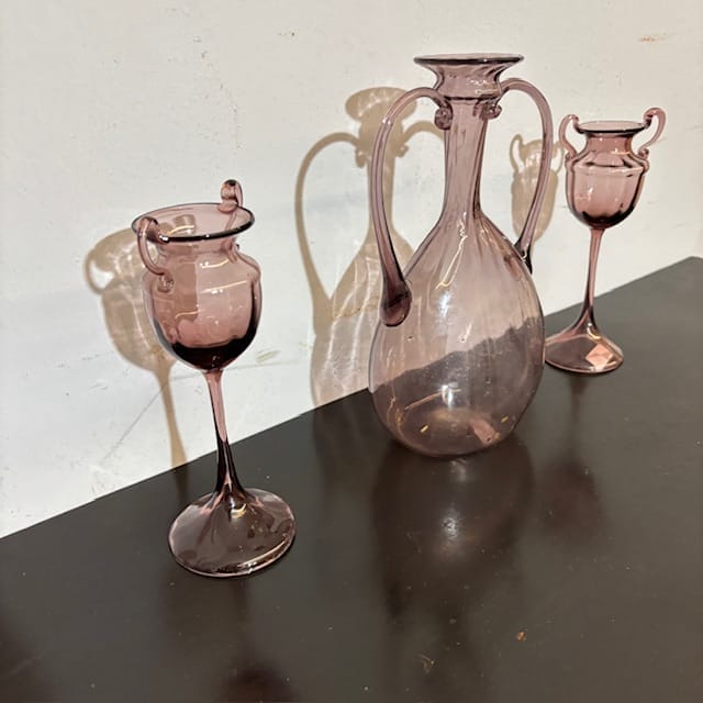 Antico Tritico in vetro rosa Amatista 1920 manifattura Zecchin – Cappellin Murano Venezia. H23 h 19 composto da ampolla più due vasi laterali . Di grande raffinatezza . L ampolla ha un difetto/ filatura sotto un manico come evidenziato dalla foto .
