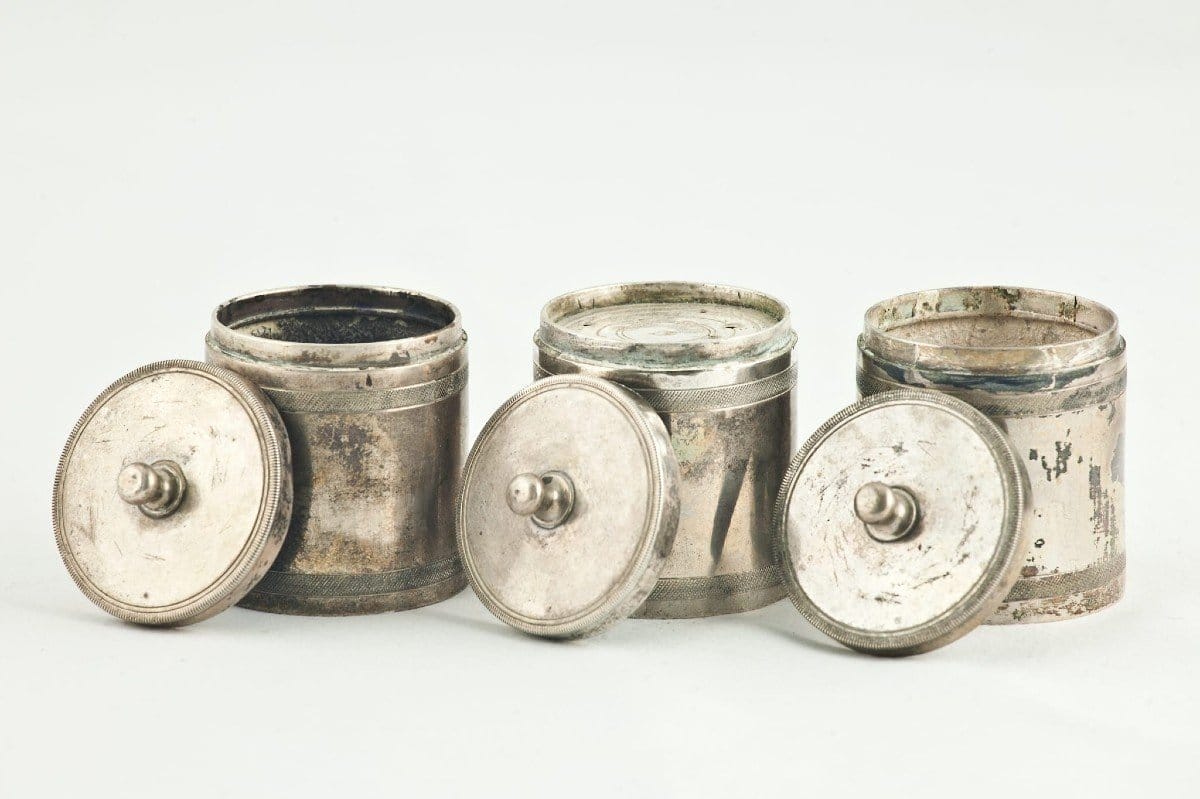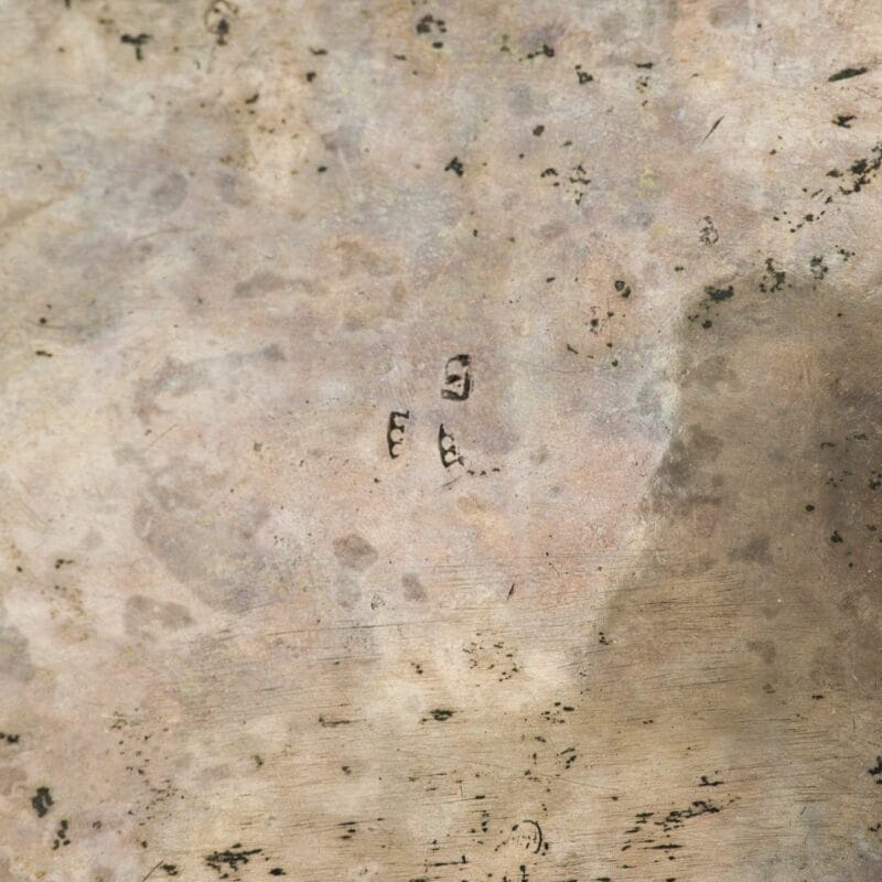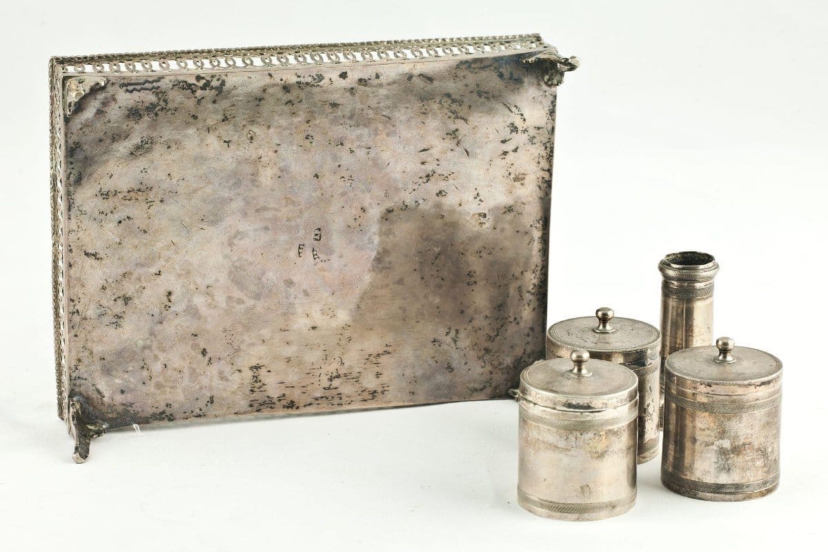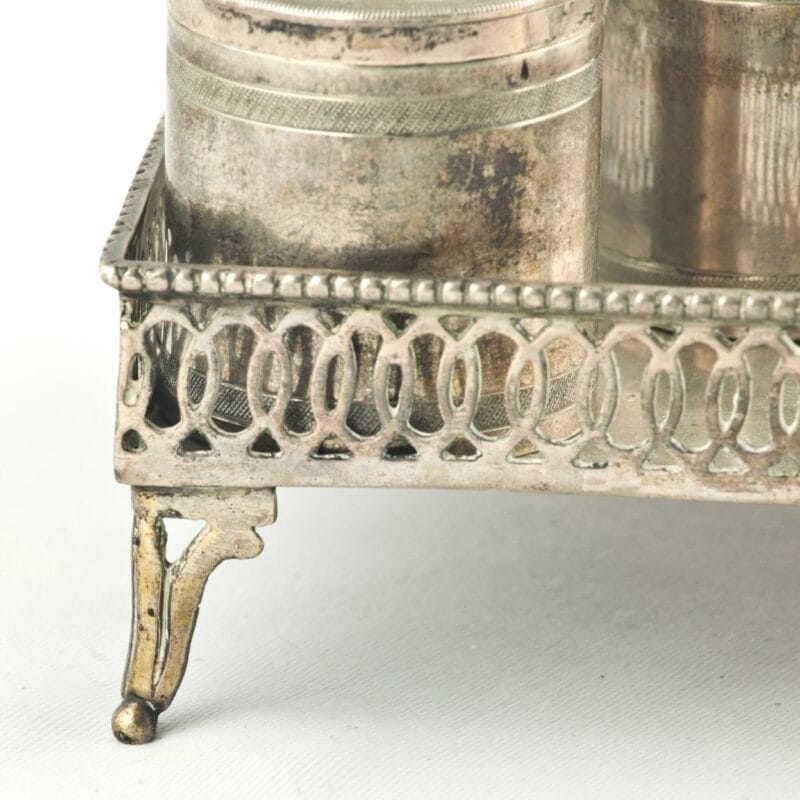 Elegante calamariera in argento napoletana, costituita da vassoio rettangolare poggiante su quattro piedi ferini stilizzati e con delicata ringhierina traforata nella parte superiore dove poggiano tre vasetti con coperchio per gli inchiostri, la polvere per asciugare ed un quarto elemento tubolare per mettere le penne in piuma d’oca usate dall’epoca. Notevole e pregiato esempio di argenteria napoletana risalente alla fine del XVIII secolo.