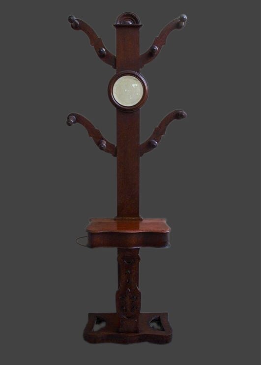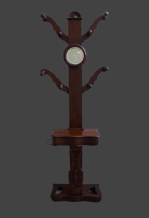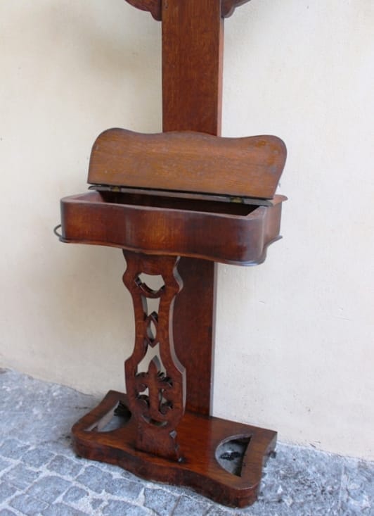 Cappelliera in rovere intagliato e consolle con piano apribile celante un vano porta oggetti.
