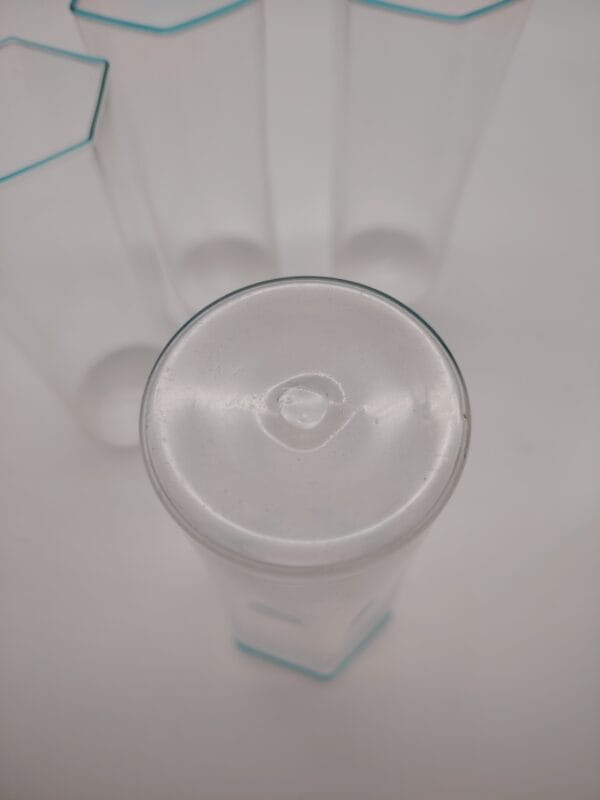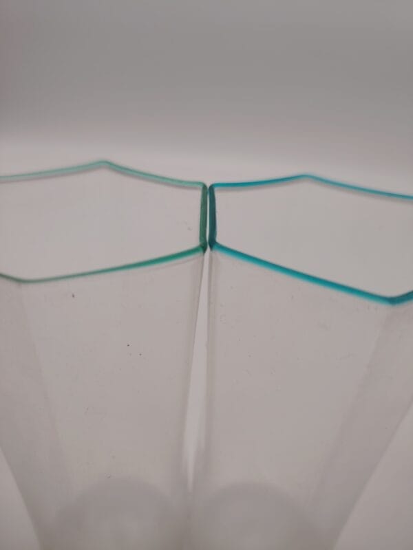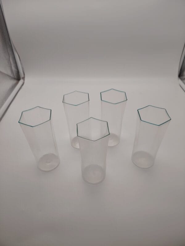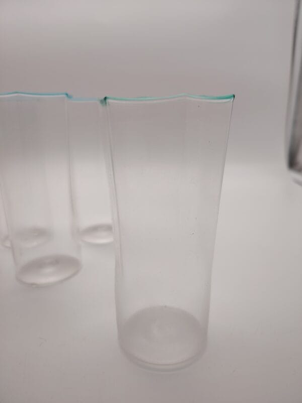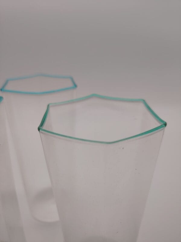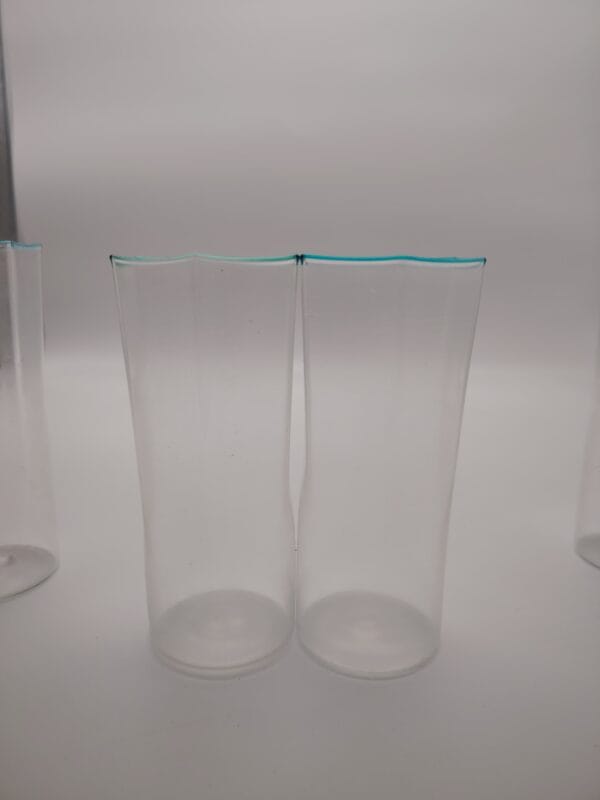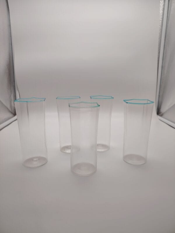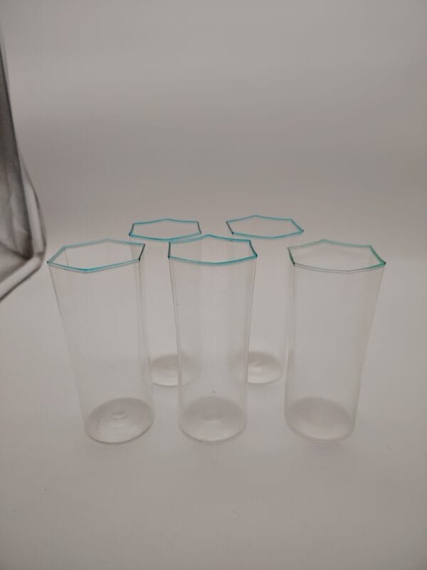 Bicchieri in vetro soffiato, quattro trasparenti con bordo azzurro, uno trasparente con bordo verde acqua.