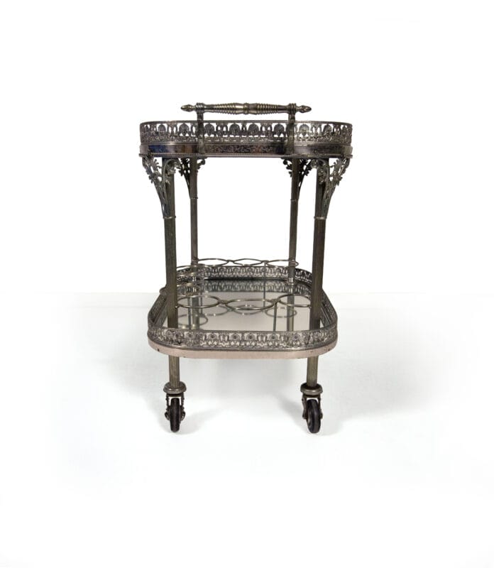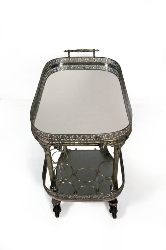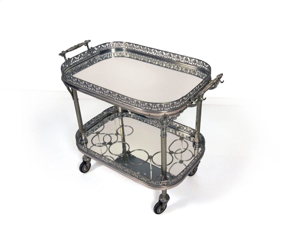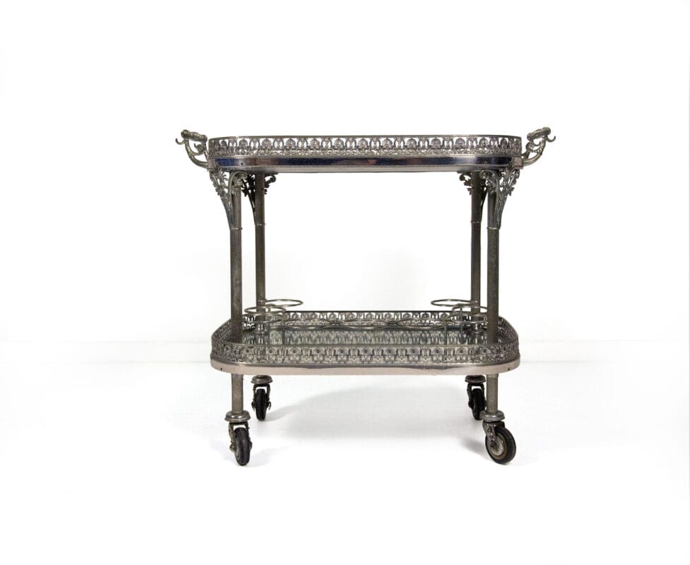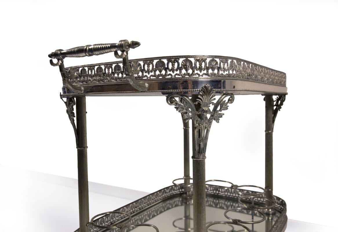 Carrello portavivande in metallo argentato, XX secolo, ghiera con decori a palmette, montanti a colonna; al piano inferiore nove anelli portabottiglie, cm 74x85x48