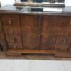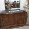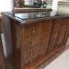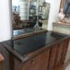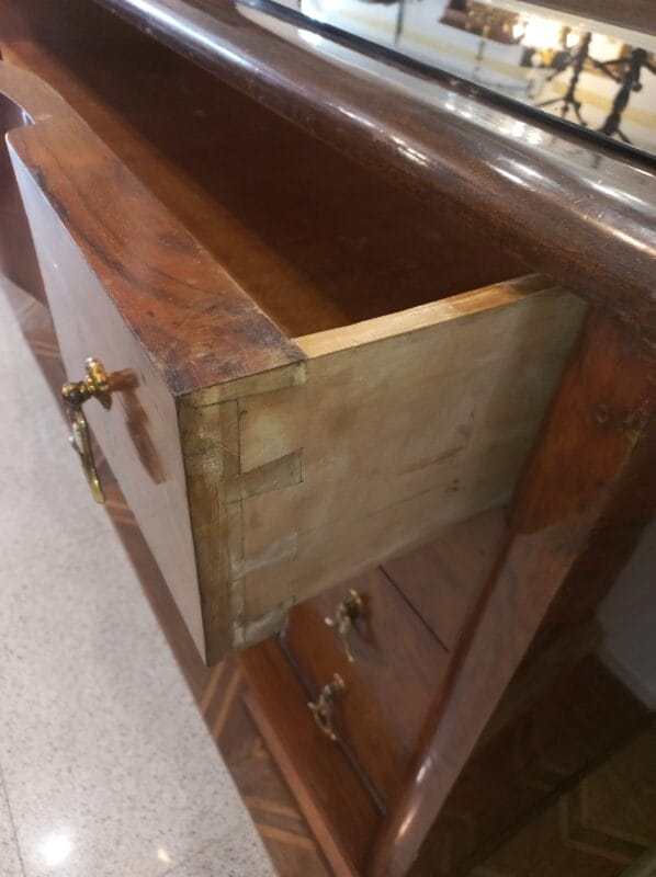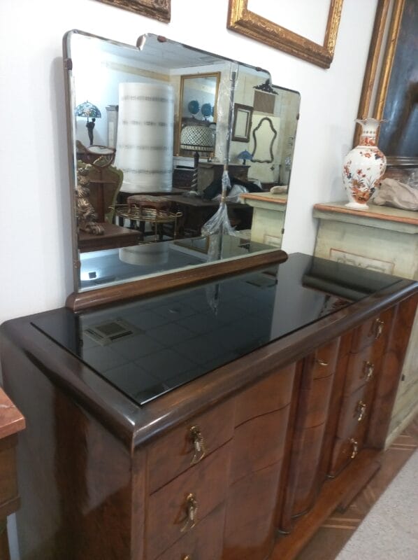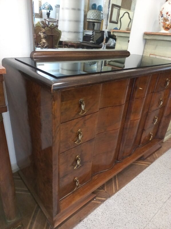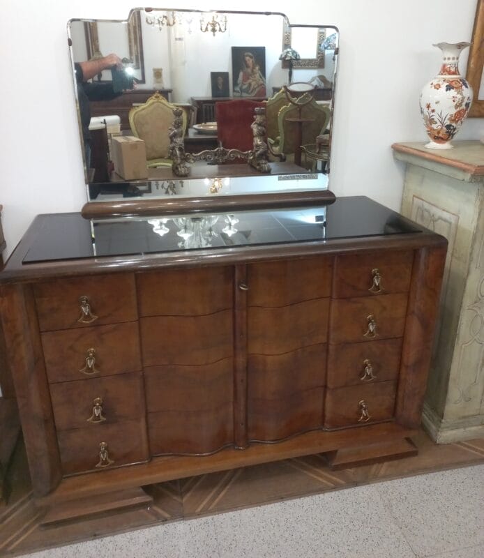 Bellissimo cassettone in noce impiallacciatura del periodo ART Deco,di origine italiana,composto da 4 cassetti. Completo di specchiera coeva,rifinito sul coperchio con vetro colorato scuro. Si presenta in perfette condizioni,trasporto da concordare. La linea dei cassetti è mossa e rientrante rispetto al corpo.