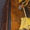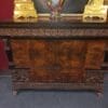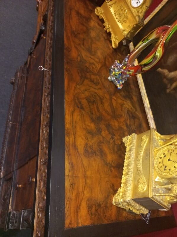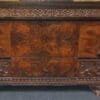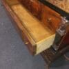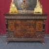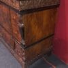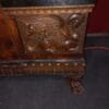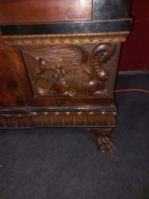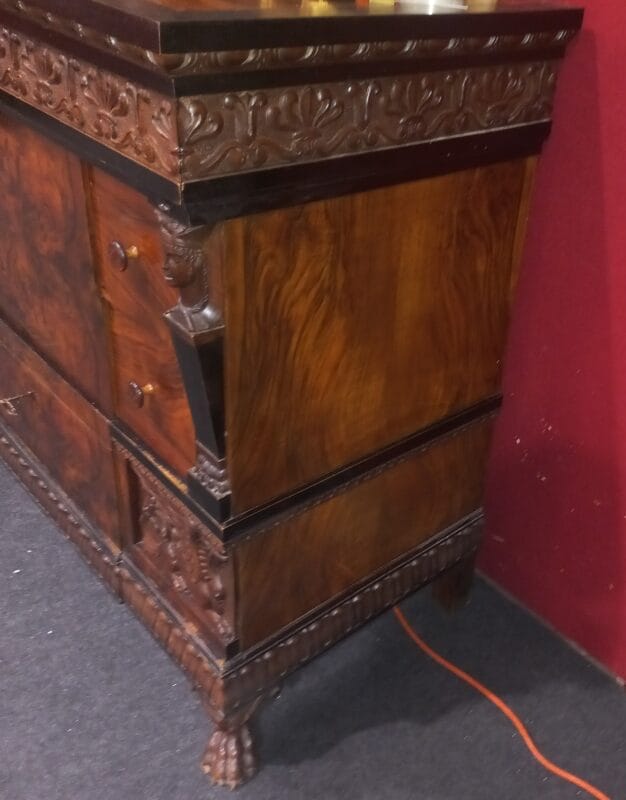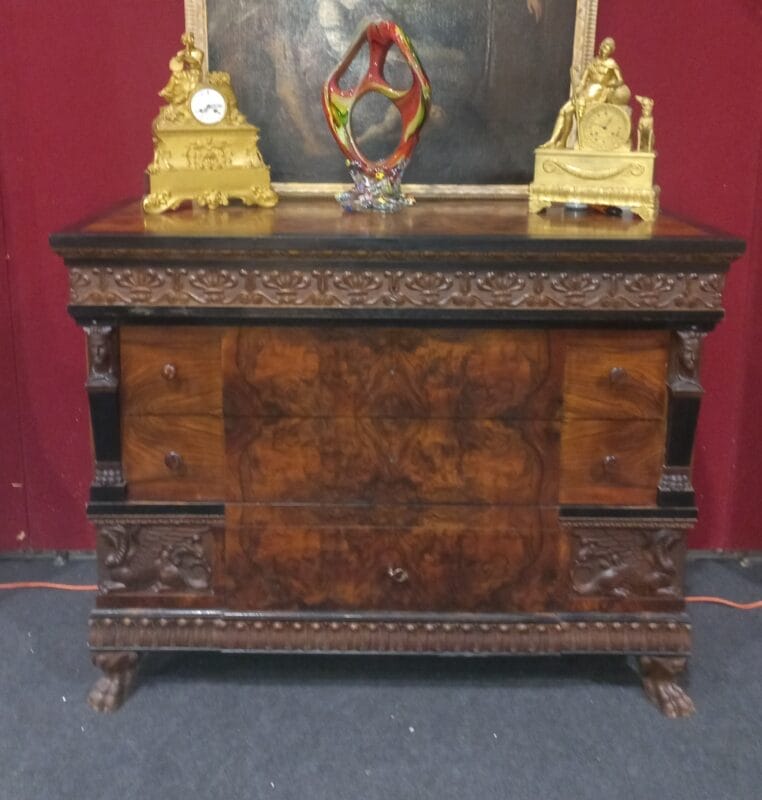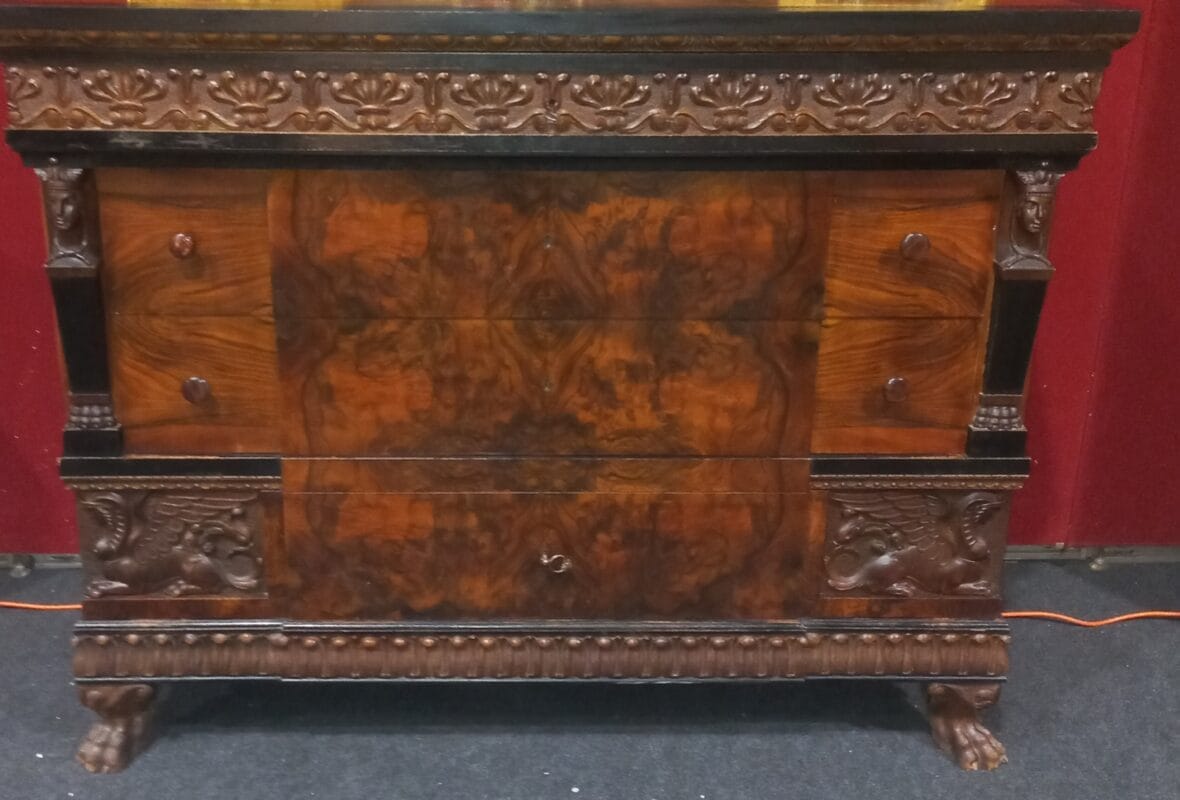Particolare cassettone in radica di noce arricchito da fregi a forma di sfinge composto da 4 cassetti di cui il primo superiore intagliato e l ultimo scolpito con sfingi. Poggia su piedi leoncini,eseguito nei primo ventennio del secolo scorso. Da ritenere e considerare come unico esemplare per cui è un pezzo raro. Trasporto da concordare.