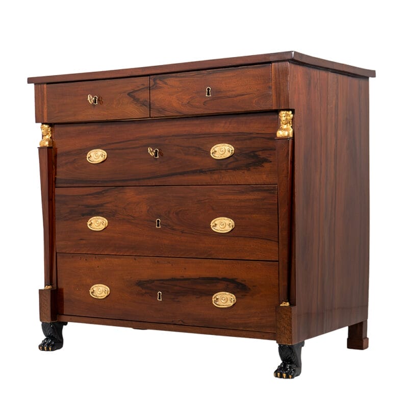 È caratterizzato da quattro ampi cassetti frontali, arricchiti da bocchette e maniglie in bronzo dorato finemente cesellato, e da montanti scanditi da eleganti colonne con testine leonine in legno dorato. I piedi anteriori, scolpiti a zampa felina e laccati in nero, donano solidità e prestigio alla struttura.