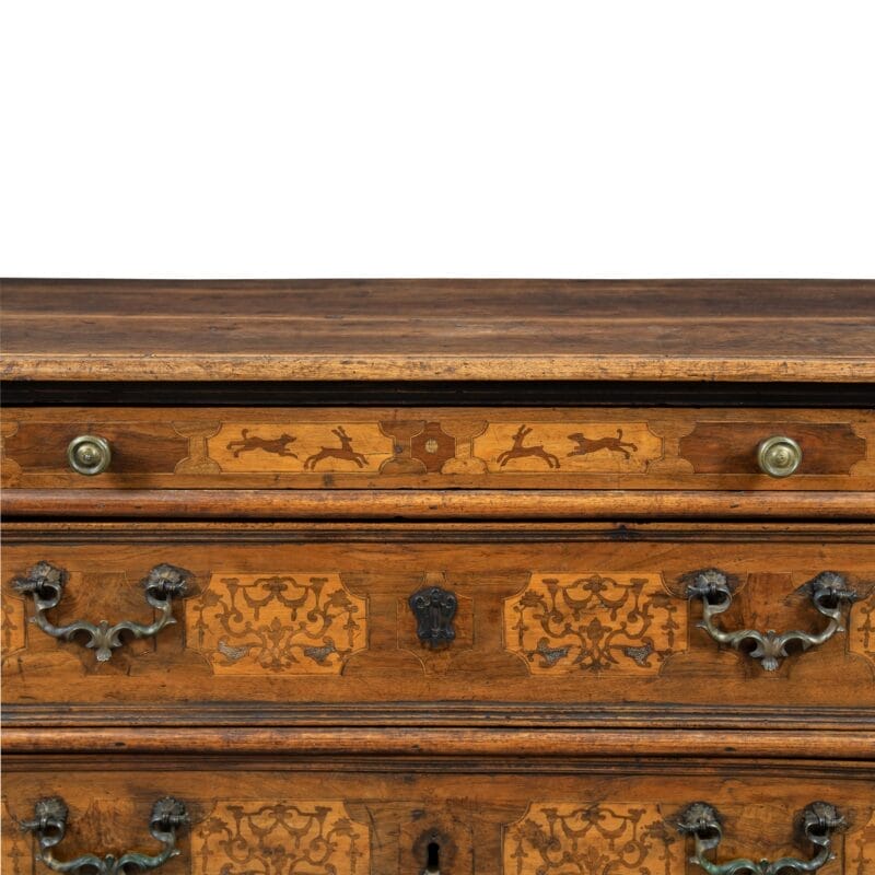 Realizzato interamente in legno massello con raffinati intarsi a motivi di scene di caccia al cervo. Fronte lineare a quattro cassetti, maniglie e bocchette originali del XVII secolo.