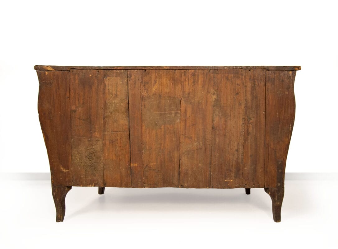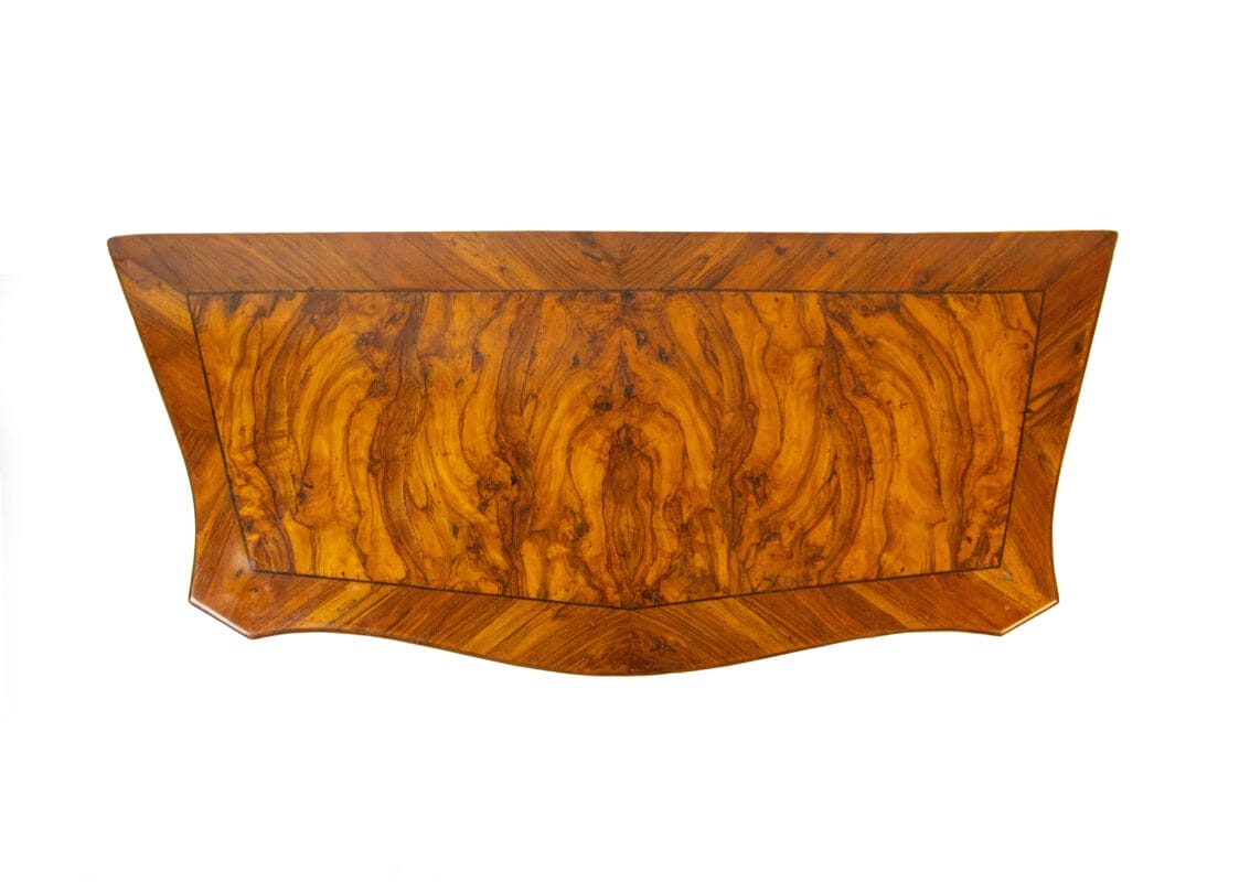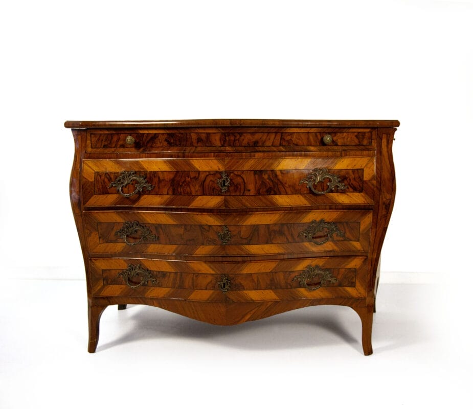 Cassettone lastronato in carrubo, noce e radica, Modena, metà del XVIII secolo, corpo mosso, fronte lievemente bombata a tre cassetti separati da traversa e sormontati da uno piccolo sotto il piano. Lesene laterali pronunciate; sui fianchi due piccoli cassetti sotto piano; grembiale sagomato e piedi mossi, cm 88x147x64