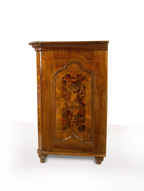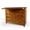 Cassettone lastronato in noce e radica, Lombardia, inizio del XVIII secolo, fronte a quattro cassetti separati da traversa, decorati da pannelli in radica a profili mistilinei entro cornici a rilievo; sotto il piano si cela un piccolo cassetto. Il piano presenta angoli sporgenti e sagomati, piedi a puntale, cm 107x138x67