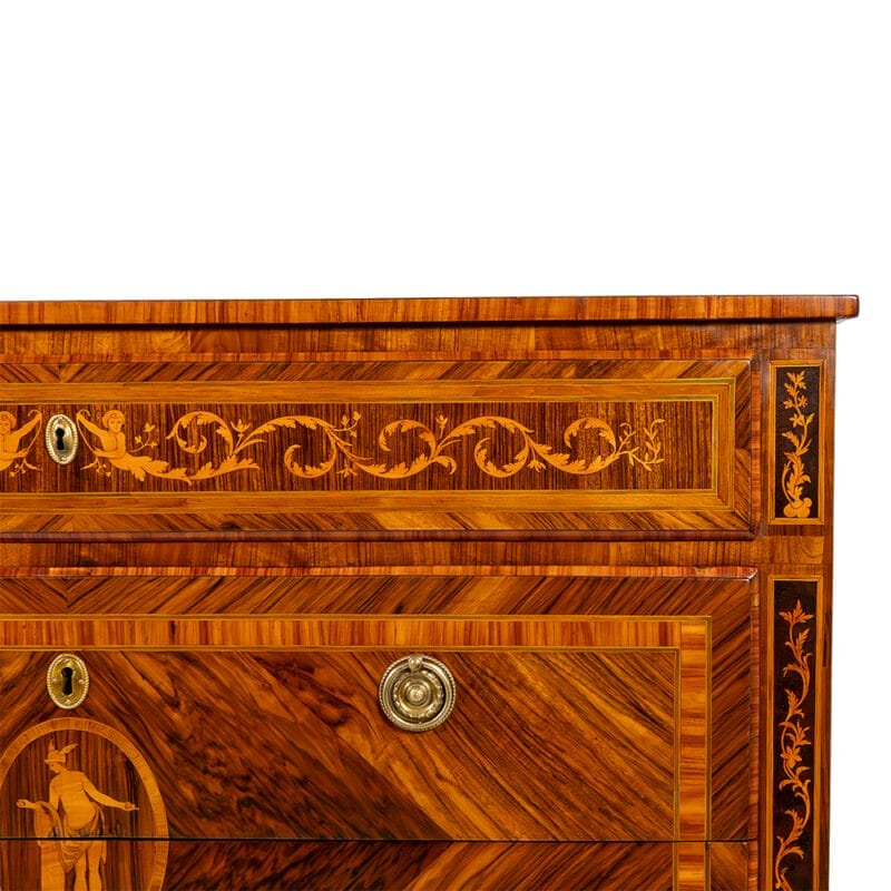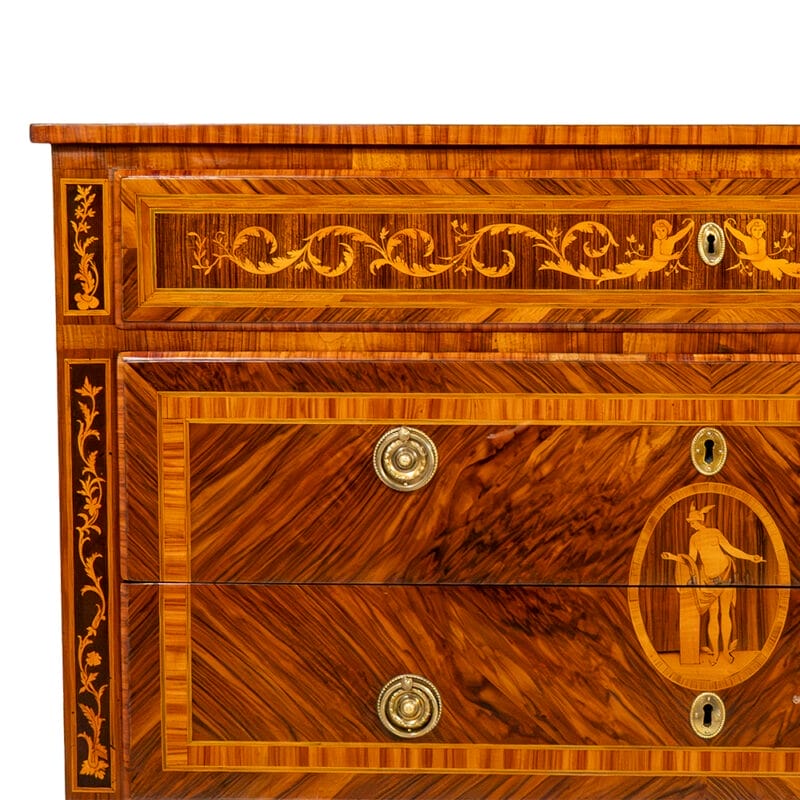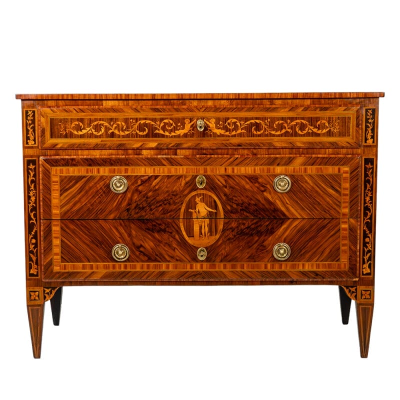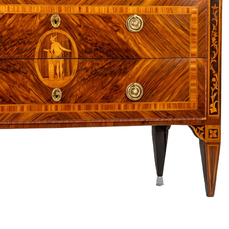 Elegante Cassettone lombardo di fine XVIII secolo, realizzato in bois de rose con raffinati intarsi in acero a motivi floreali e figurativi. Il mobile presenta tre cassetti frontali, di cui il primo sottolineato da un raffinato fregio a volute vegetali, mentre i due sottostanti sono arricchiti da medaglioni centrali con figure intarsiate. Le fiancate, anch’esse decorate con scene a tarsia, conferiscono all’insieme un’armonia di grande equilibrio formale.