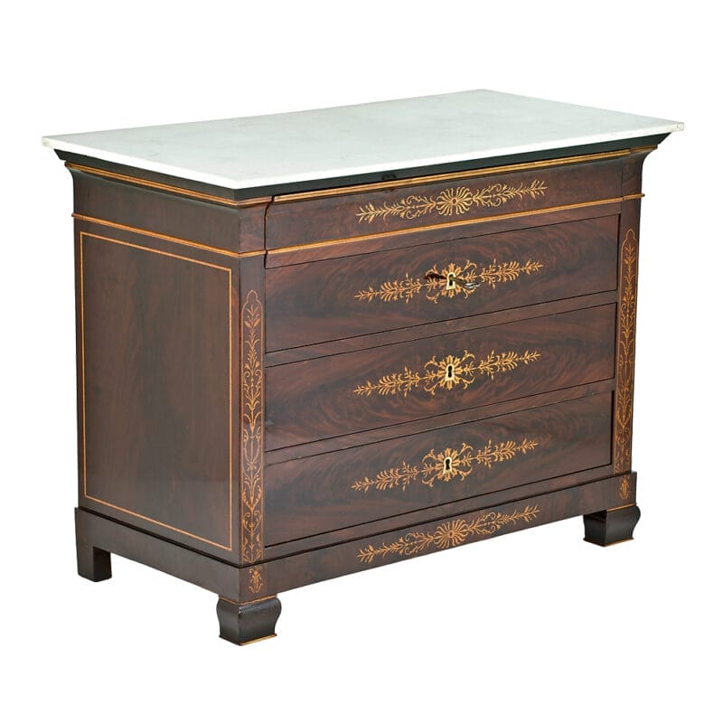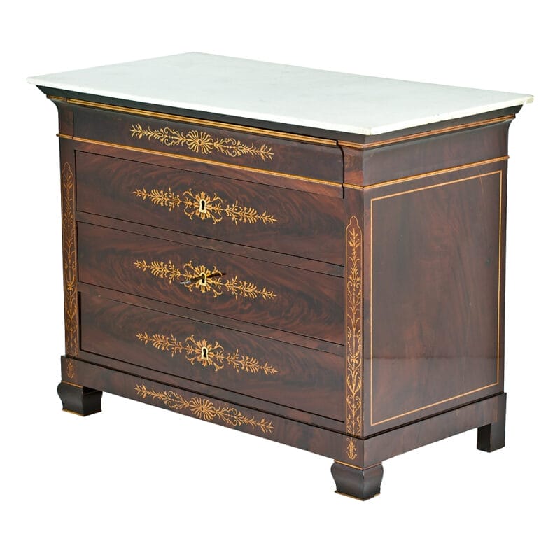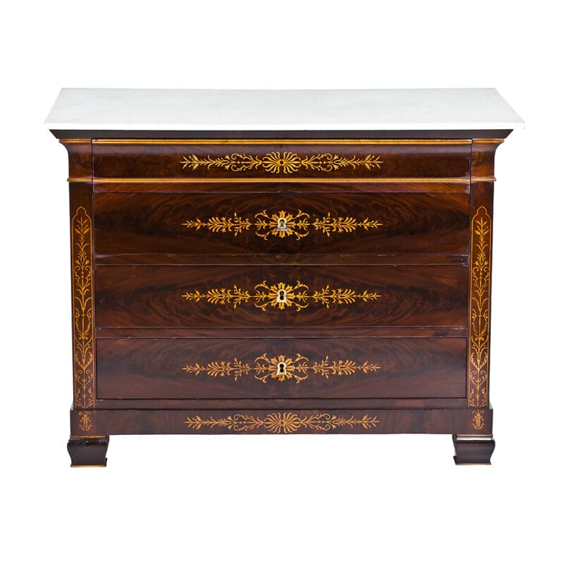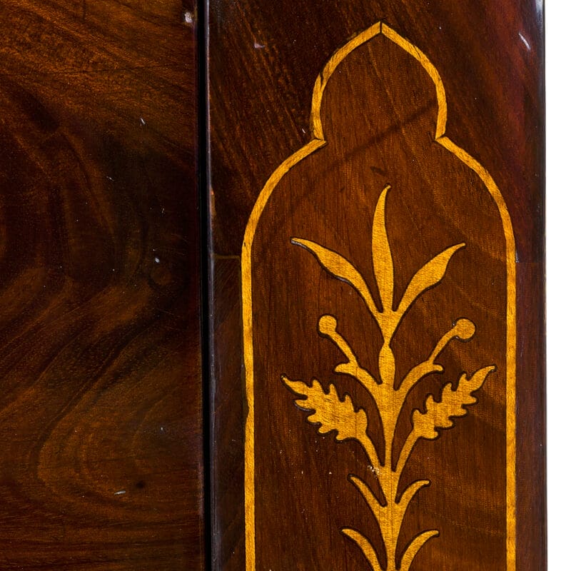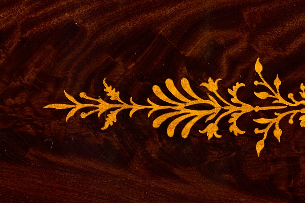 Elegante Cassettone Smith Napoletano dei primi dell’Ottocento, realizzato in pregiato legno di piuma di mogano, caratterizzato da una straordinaria luminosità e movimento delle venature. L’opera si distingue per i raffinati intarsi in legno di acero, eseguiti con maestria e gusto ornamentale, che impreziosiscono i frontali dei cassetti e i fianchi del mobile con motivi fitomorfi e simmetrici di grande eleganza.