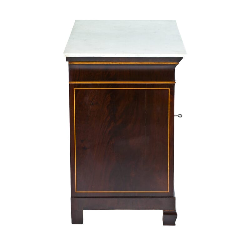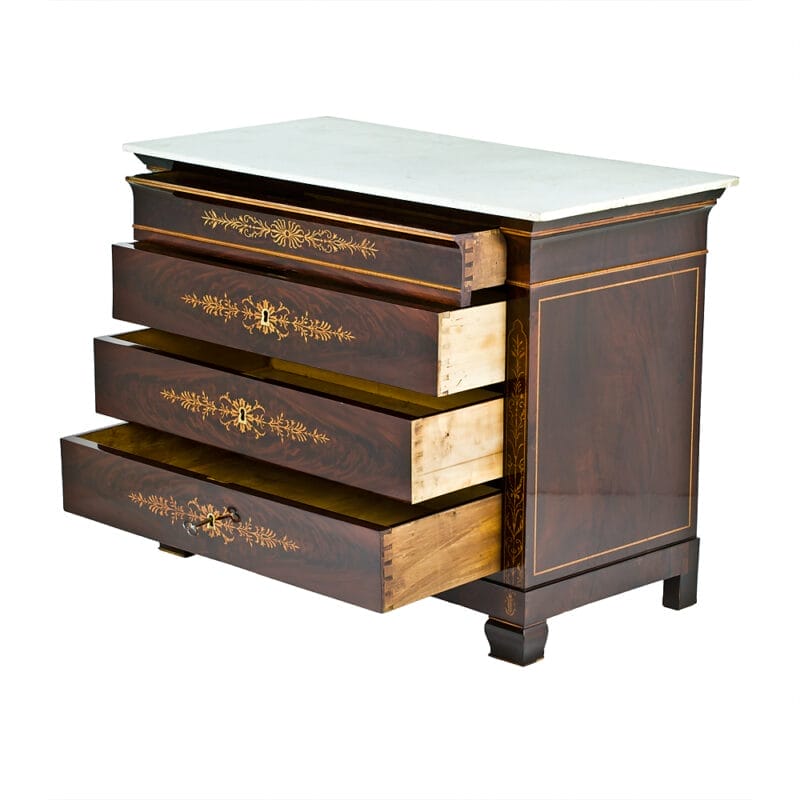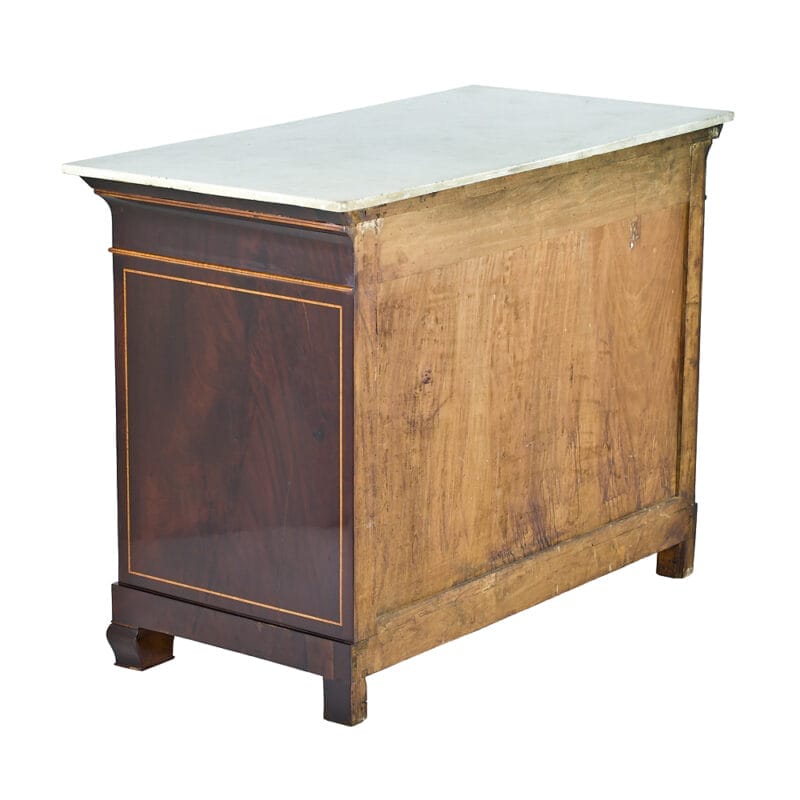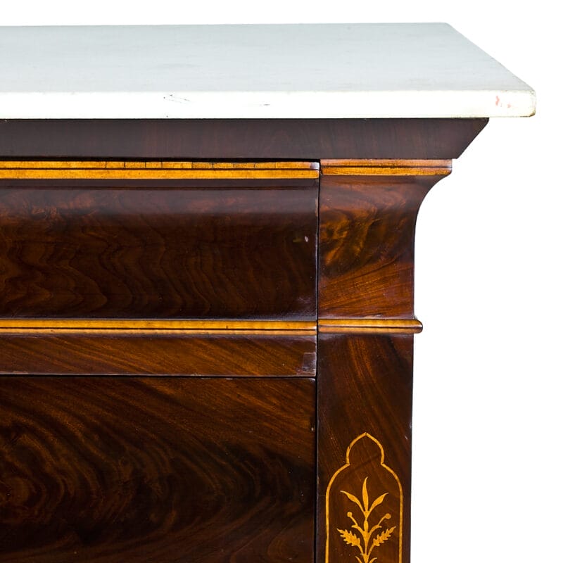 Il piano superiore è in pregiato marmo bianco statuario, dalle linee sobrie e raffinate, che conferisce luminosità e nobile equilibrio all’intera struttura. Le proporzioni armoniose e la qualità delle finiture fanno di questo cassettone un autentico esempio di alta ebanisteria partenopea dell’epoca.