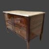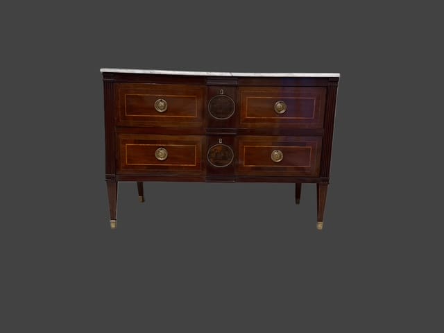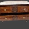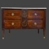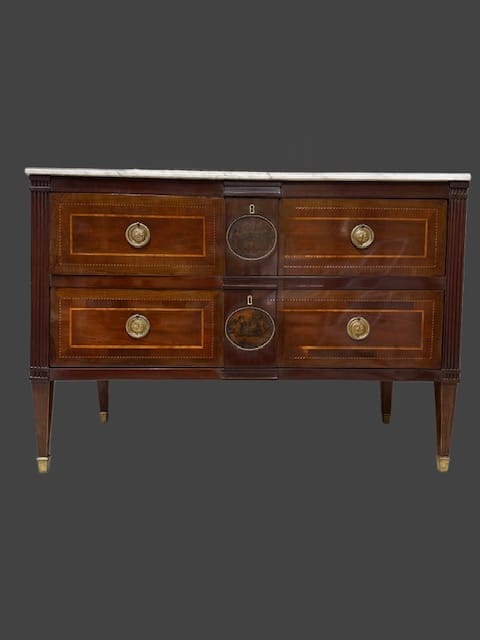 Cassettone in mogano con intarsi in legni vari e pregiati. Al centro dei cassetti medaglioni ovali dipinti raffiguranti scene romantiche. Applicazioni in bronzo cesellato e dorato. Piano in marmo bianco di Carrara.