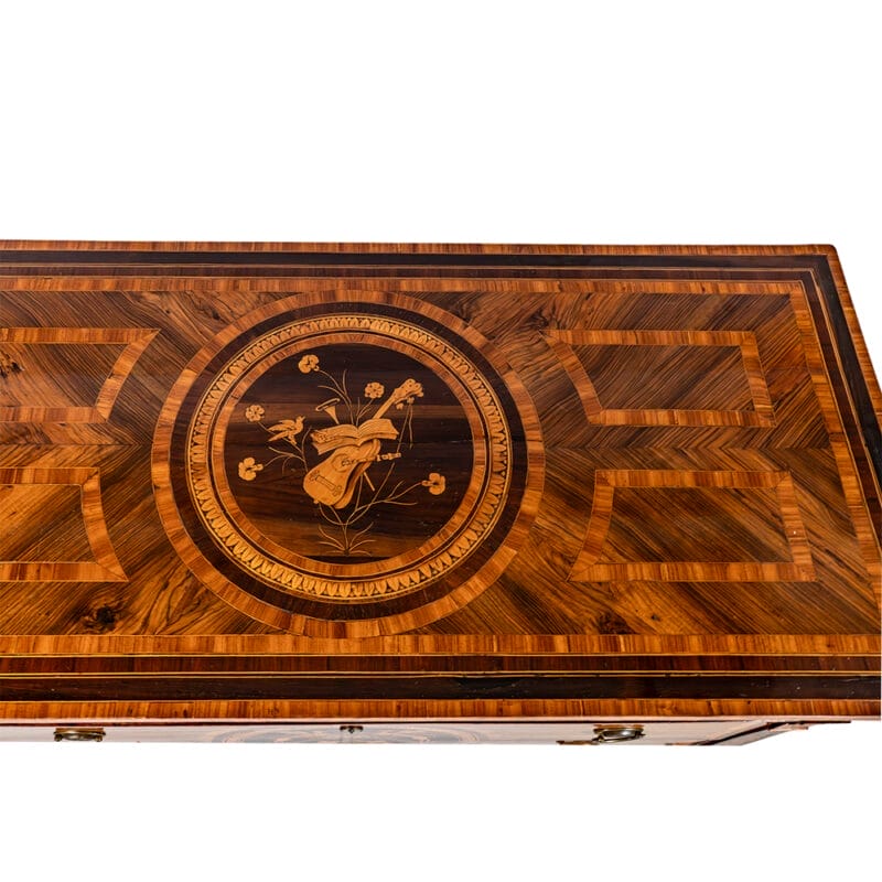 Elegante e rarissimo Cassettone lombardo di epoca tardo Settecento, realizzato in legno di noce con ricca e raffinata decorazione a tarsia. Il piano e i frontali presentano complessi intarsi geometrici e figurativi eseguiti con essenze pregiate quali acero, palissandro, bois de rose e altri legni rari, creando effetti cromatici di straordinaria raffinatezza.