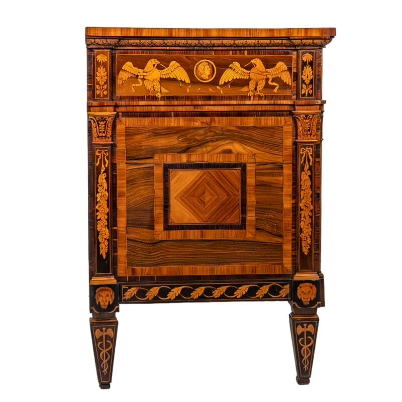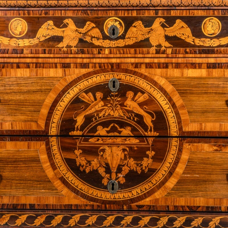 Il fronte è caratterizzato da due ampi cassetti decorati al centro da una riserva circolare con motivi classici, mentre la fascia superiore è ornata da fregi con figure alate e medaglioni. Le lesene angolari e i fianchi, anch’essi finemente intarsiati, completano la preziosità dell’insieme.