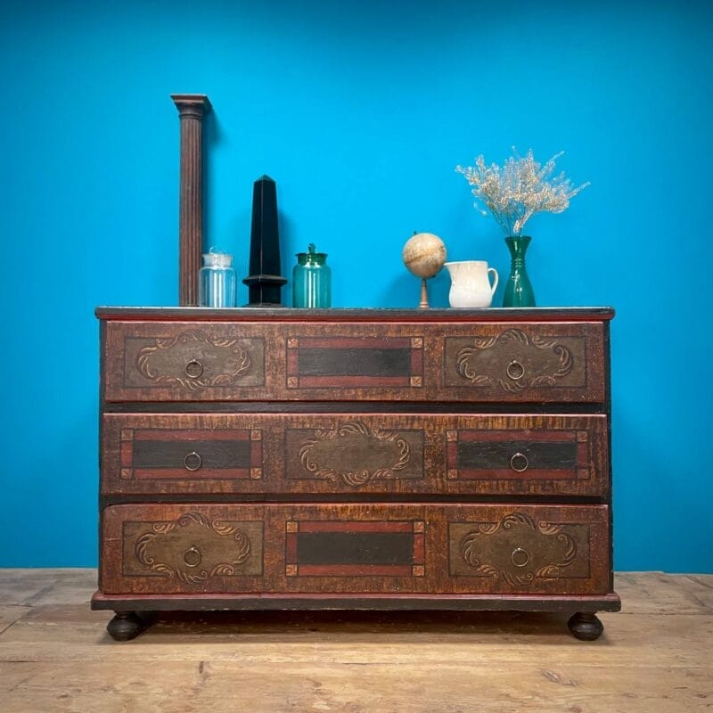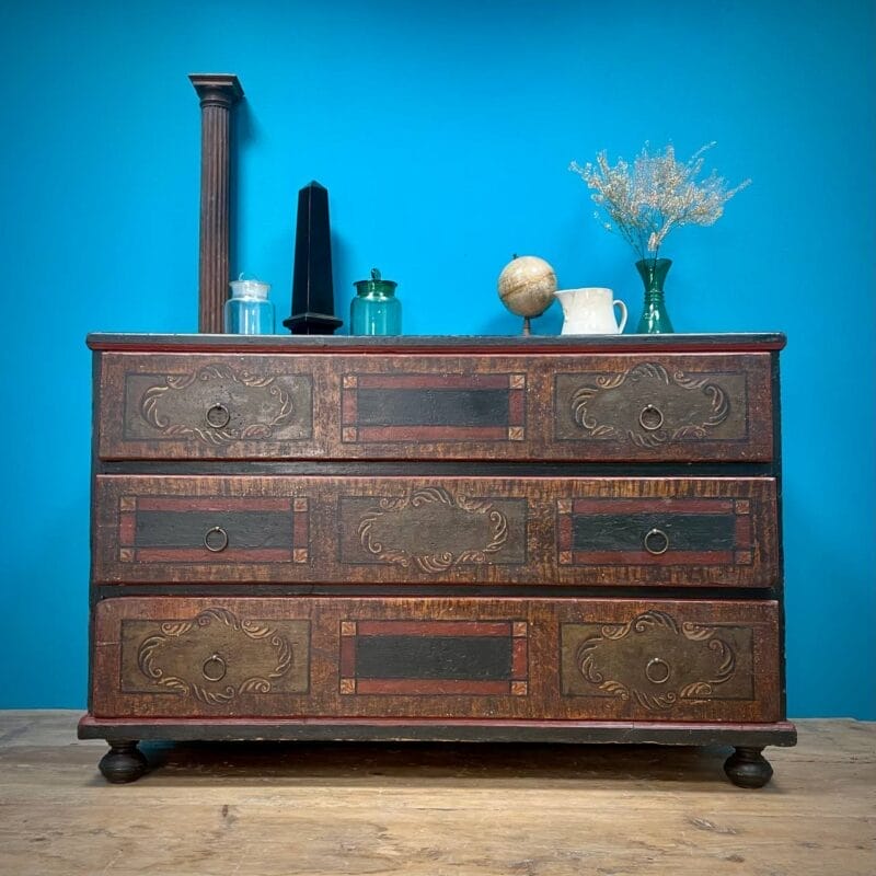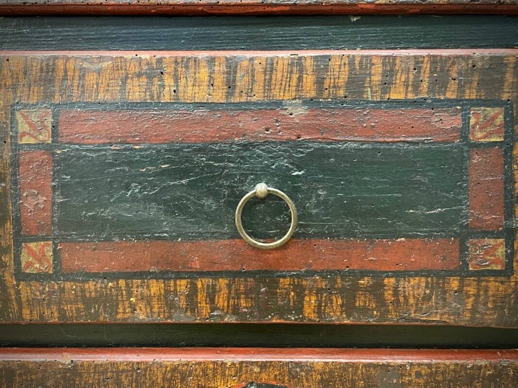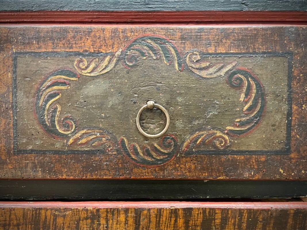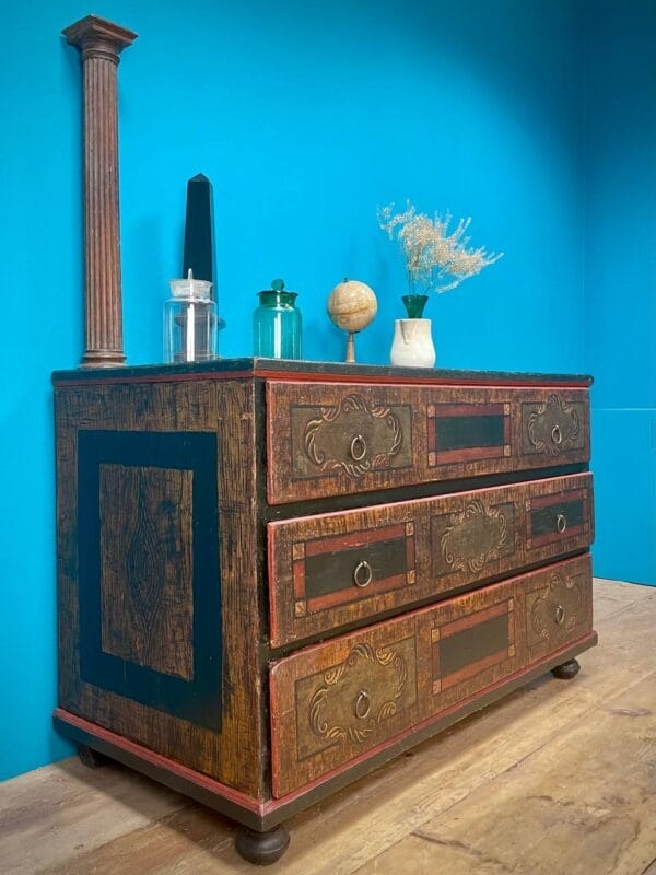 Cassettone Tirolese laccato a finto legno e motivi geometrici