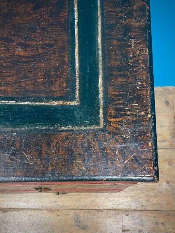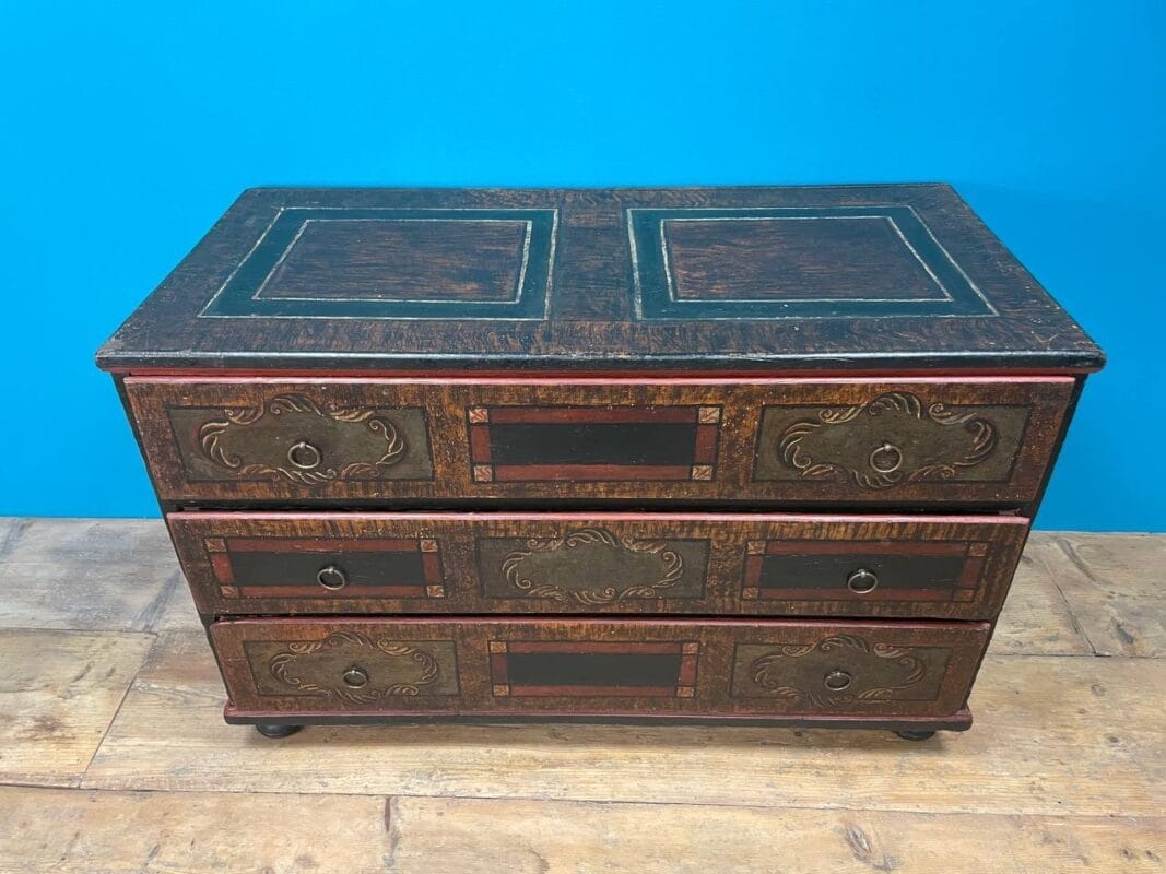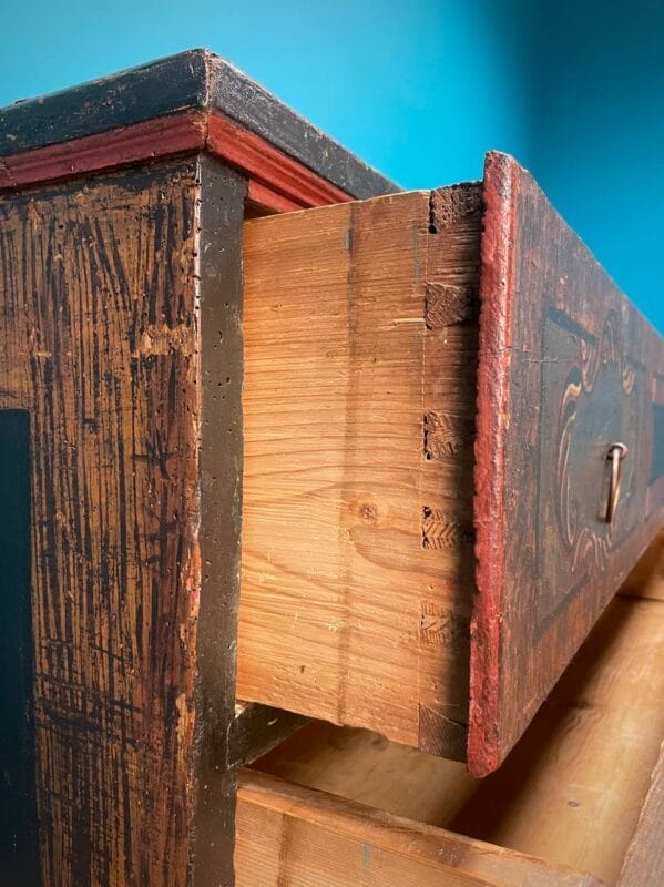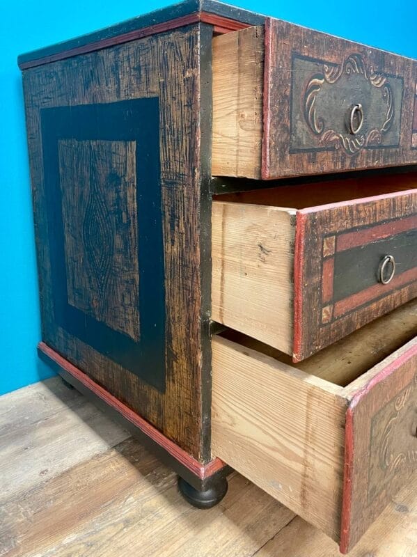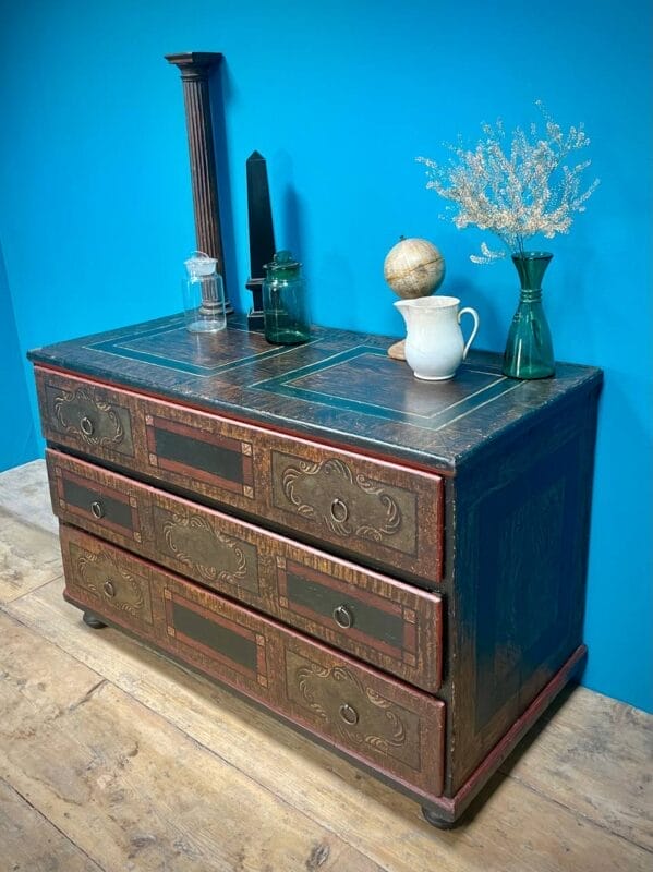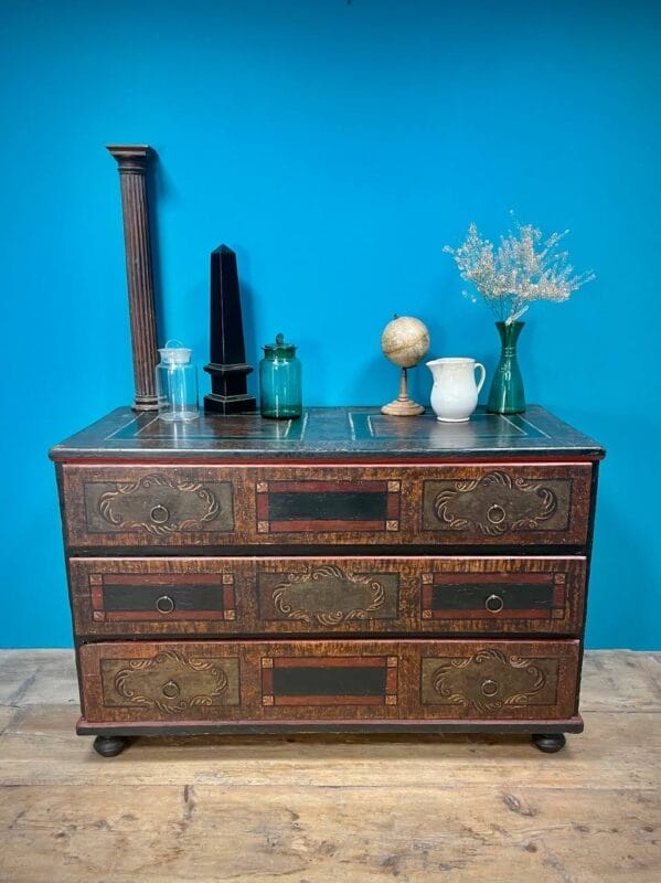 Cassettone Tirolese laccato a finto legno e motivi geometrici