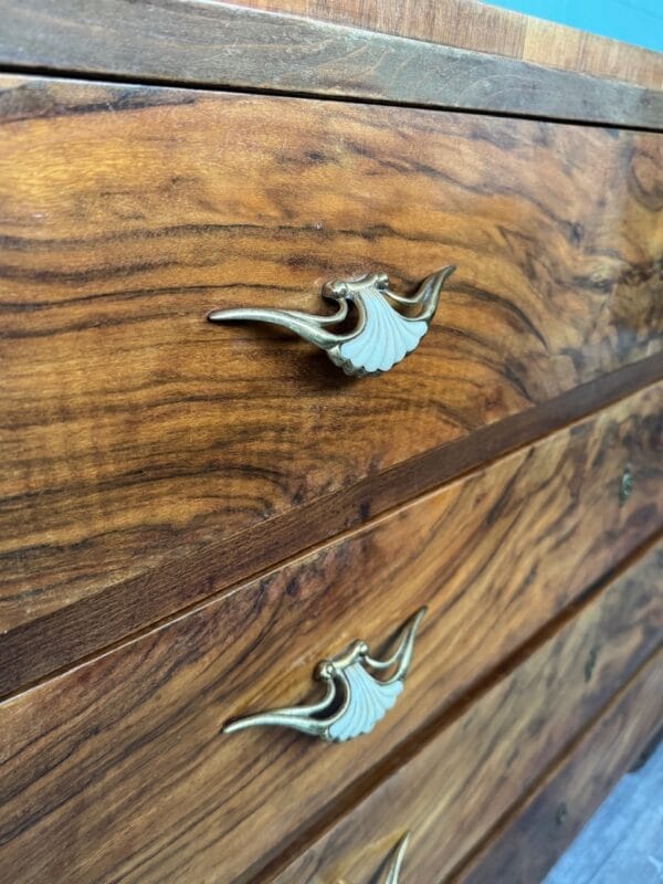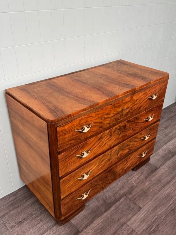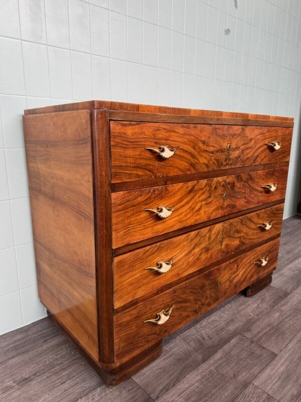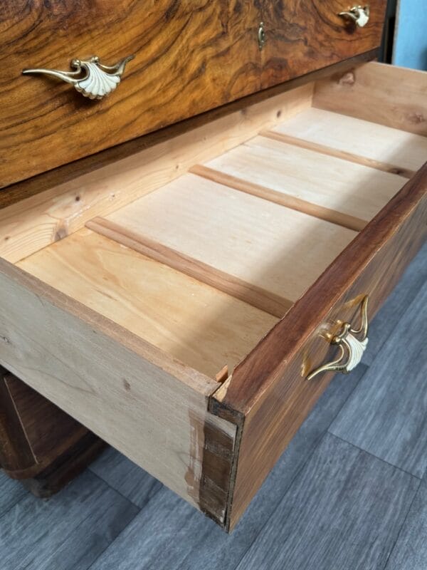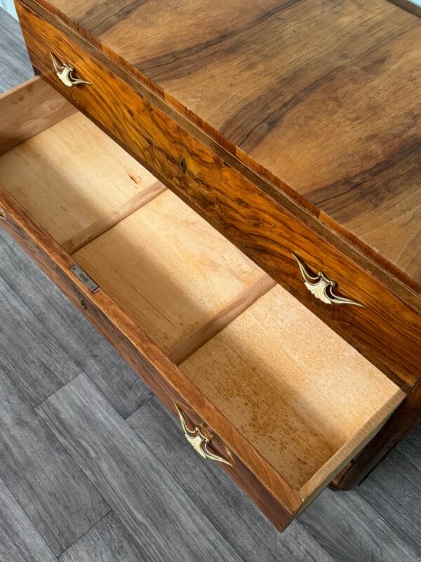 Il mobile presenta un’impiallacciatura in radica altamente figurata, che mostra venature del legno ricche e ondulate, tipiche dello stile Art Déco.