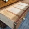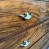 Le maniglie a conchiglia in ottone e bachelite bianco e le serrature a buco della serratura sono in ottone che forniscono un contrasto decorativo con il legno caldo.