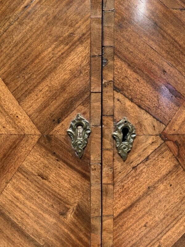 Il disegno del comò rispecchia fedelmente le istanze estetiche della mobilia metà del XVIII secolo, insofferente alla linea dritta e dedita invece alla grazia della linea curva risultando pertanto mosso in tutti e tre i fronti, nelle gambe “en cabriole” e nell’aggraziata grembialina sotto gli sportelli.