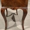 Proprio la silhouette della grembialina (insieme anche ad altri particolari per la verità) marca inequivocabilmente la provenienza siciliana di questo comodino. La sua facies è animata e dominata da una vibrante e nervosa spinatura lastronata in legno noce disposta simmetricamente a formare un disegno romboidale sul fronte dei due sportelli e sul fronte del cassetto sotteso ad essi. Il piano sagomato è impreziosito da una bella lastra di marmo breccia di Aleppo della stessa epoca. I due sportelli sopracitati celano un ampio vano, infine un piccolo cassettino centrato da boccetta metallica chiude il disegno nella parte bassa.