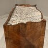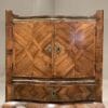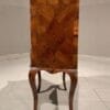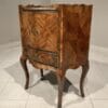 Proprio la silhouette della grembialina (insieme anche ad altri particolari per la verità) marca inequivocabilmente la provenienza siciliana di questo comodino. La sua facies è animata e dominata da una vibrante e nervosa spinatura lastronata in legno noce disposta simmetricamente a formare un disegno romboidale sul fronte dei due sportelli e sul fronte del cassetto sotteso ad essi. Il piano sagomato è impreziosito da una bella lastra di marmo breccia di Aleppo della stessa epoca. I due sportelli sopracitati celano un ampio vano, infine un piccolo cassettino centrato da boccetta metallica chiude il disegno nella parte bassa.