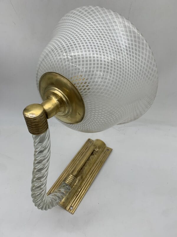 Coppia di applique dal design elegante e vintage, attribuite a Venini, ciascuna composta da un diffusore in vetro soffiato lattimo dalla forma conica ampia, caratterizzato da un raffinato motivo “a reticello” diagonale che crea un effetto visivo leggero e prezioso; il vetro, semitrasparente e finemente lavorato, diffonde la luce in modo delicato e uniforme, producendo una luminosità morbida e decorativa; Vetro fatto a mano a Murano.Il vetro ha qualche piccola sbeccatura. Se le lampade saranno spedite il vetro si può smontare. La struttura di supporto è realizzata in ottone . Il contrasto tra la brillantezza del metallo e la texture lattiginosa del vetro conferisce alle applique un’estetica raffinata, tipica della produzione di metà Novecento; i dettagli costruttivi suggeriscono un lavoro artigianale accurato, con vetro realizzato a mano a Murano e componenti metallici ben rifiniti; l’insieme risulta ideale per ambienti eleganti o arredamenti rétro, aggiungendo un tocco luminoso e decorativo di grande ricercatezza. Ogni applique ha un portalampade e 27. Si possono montare con la coppa rivolta verso l’alto o verso il basso.