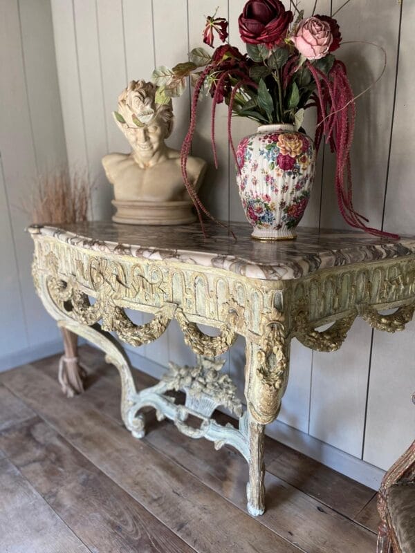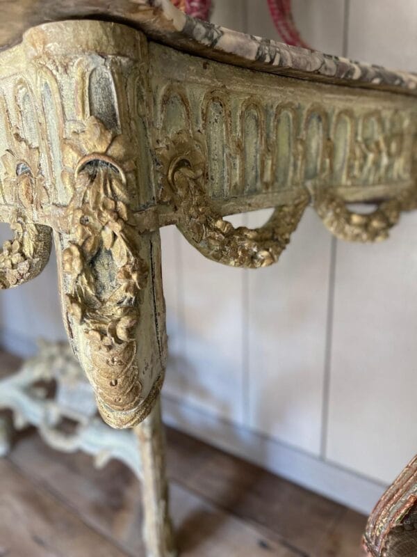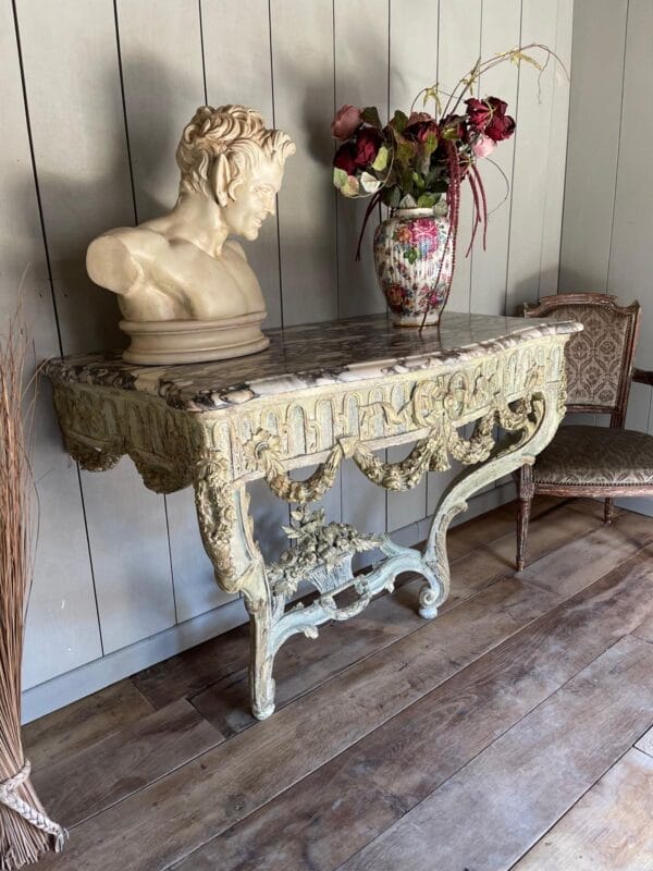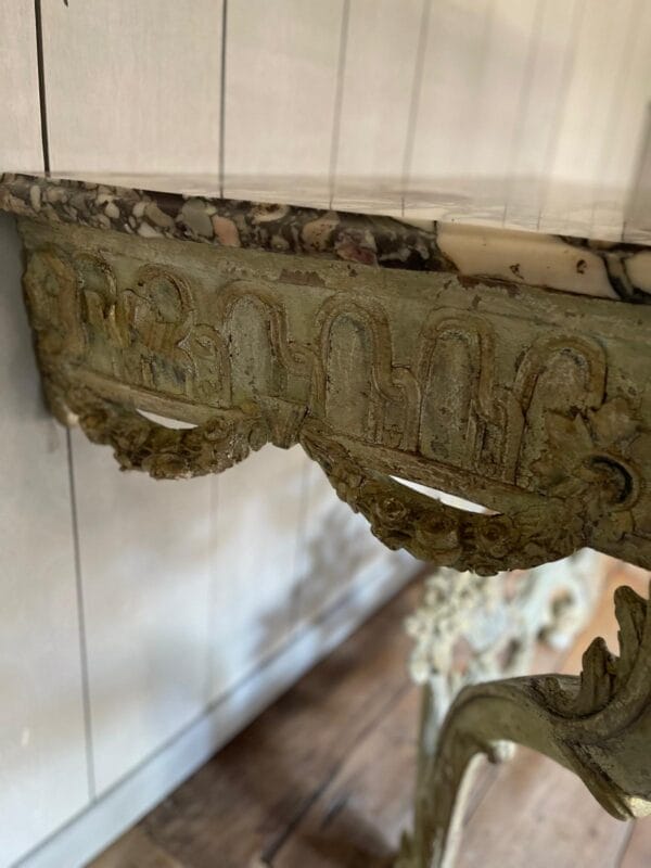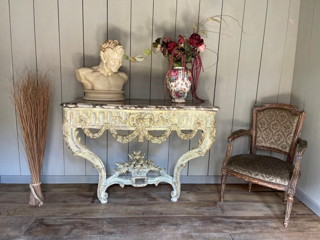 magnifique console, sculpter avec une très jolie patine, Louis XV, transition d’époque datant du XVIIIe siècle, aucune restauration marbre, brèche
