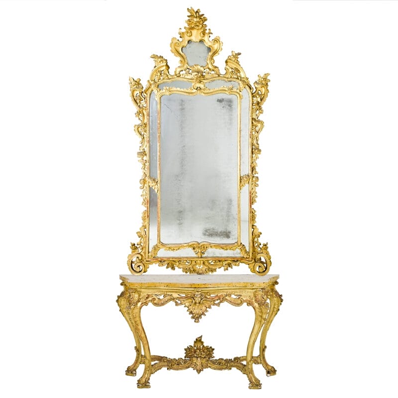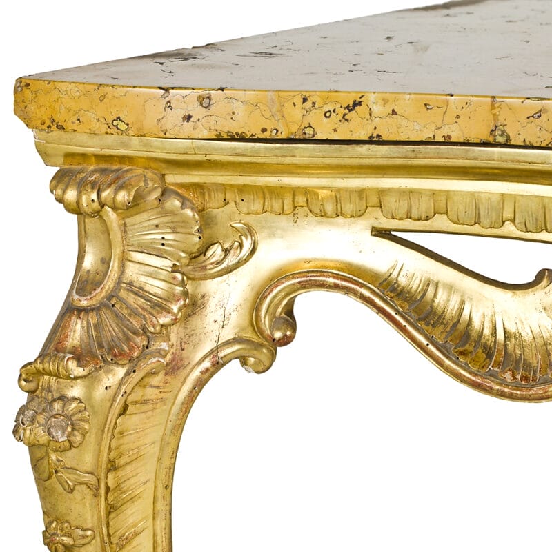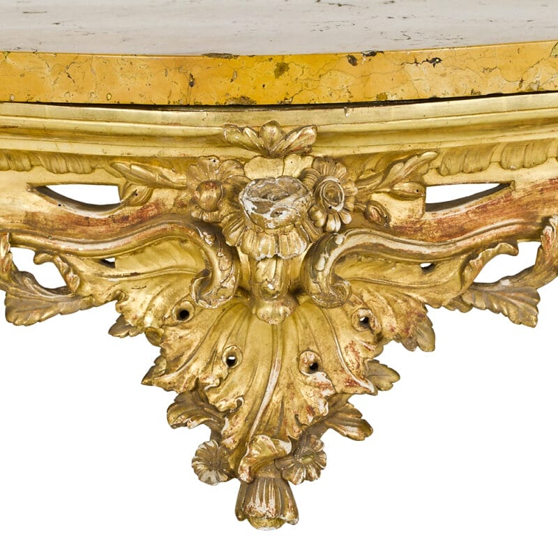 Consolle con Specchiera in legno dorato e piano in marmo giallo di Siena, di epoca Luigi XV della metà del Settecento e provenienza napoletana.