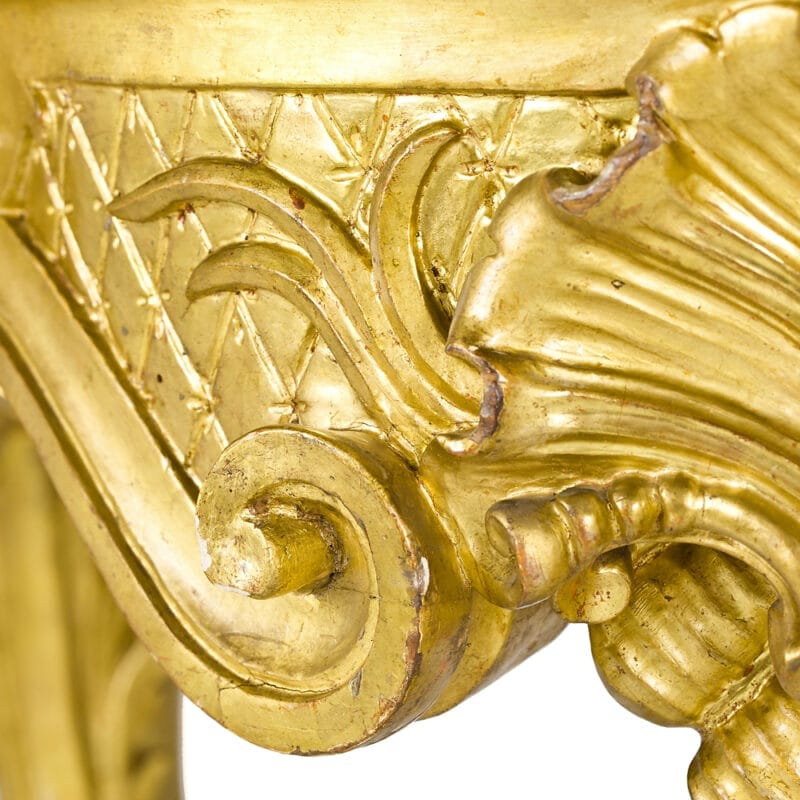 Importante Consolle Luigi XV di epoca della prima metà del Settecento e provenienza romana. Realizzata in legno intagliato e dorato e piano in marmo giallo di Siena.