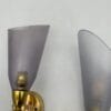 Coppia di applique con base e braccio in ottone, caratterizzati da una struttura curva con elemento sferico vicino all’attacco del portalampada; i diffusori sono in vetro satinato e acidato a forma conica allungata, inclinati verso l’alto e con leggera tonalità violacea, fissati alla montatura attraverso un portalampada dorato che si raccorda con armonia alla geometria del supporto murale.Restaurate e funzionati , lampade della ditta Seguso; 1950 circa.