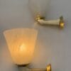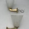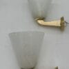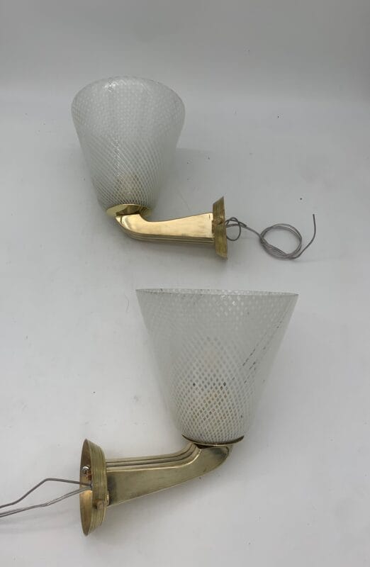 Coppia di applique dal design elegante e vintage, attribuite a Venini, ciascuna composta da un diffusore in vetro soffiato lattimo dalla forma conica ampia, caratterizzato da un raffinato motivo “a reticello” diagonale che crea un effetto visivo leggero e prezioso; il vetro, semitrasparente e finemente lavorato, diffonde la luce in modo delicato e uniforme, producendo una luminosità morbida e decorativa; Vetro fatto a mano a Murano. Se le lampade saranno spedite il vetro si può smontare. La struttura di supporto è realizzata in bronzo con finitura della placca da fissare alla parete di ottone lucido. Il contrasto tra la brillantezza del metallo e la texture lattiginosa del vetro conferisce alle applique un’estetica raffinata, tipica della produzione di metà Novecento; i dettagli costruttivi suggeriscono un lavoro artigianale accurato, con vetro realizzato a mano a Murano e componenti metallici ben rifiniti; l’insieme risulta ideale per ambienti eleganti o arredamenti rétro, aggiungendo un tocco luminoso e decorativo di grande ricercatezza. Ogni applique ha un portalampade e 27. Si possono montare con la coppa rivolta verso l’alto o verso il basso.