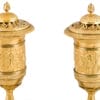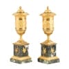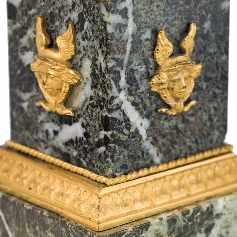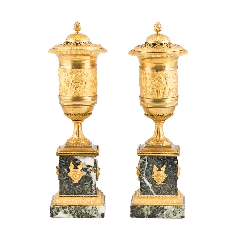 Raffinatissima coppia di Bruciaprofumi realizzati in pregiato bronzo dorato a mercurio e marmo verde delle alpi, di provenienza francese ed epoca i primi dell’Ottocento.